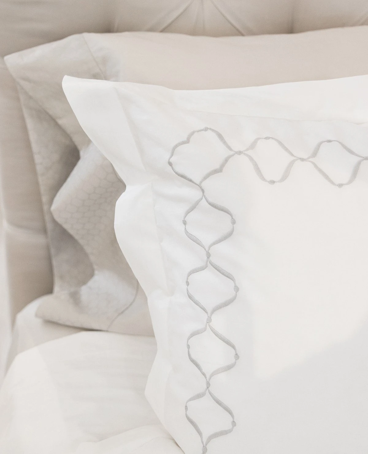 Our Aida Embroidery collection is a timeless Italian classic, embroidered in Italy on white or milk 220 thread count Egyptian cotton percale and available in 6 different stitch colours. The Aida collection is custom-made in Italy for you, so please allow 8-10 weeks for delivery.