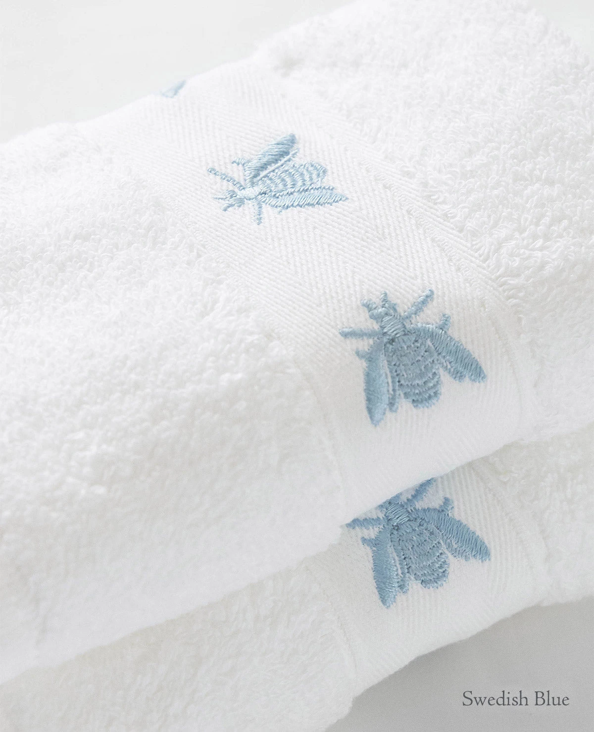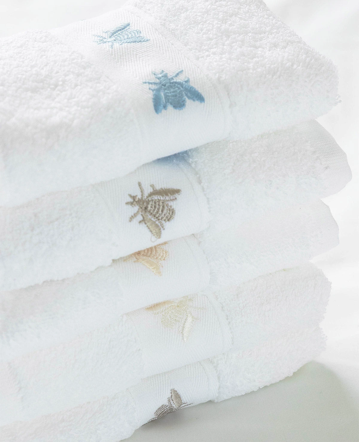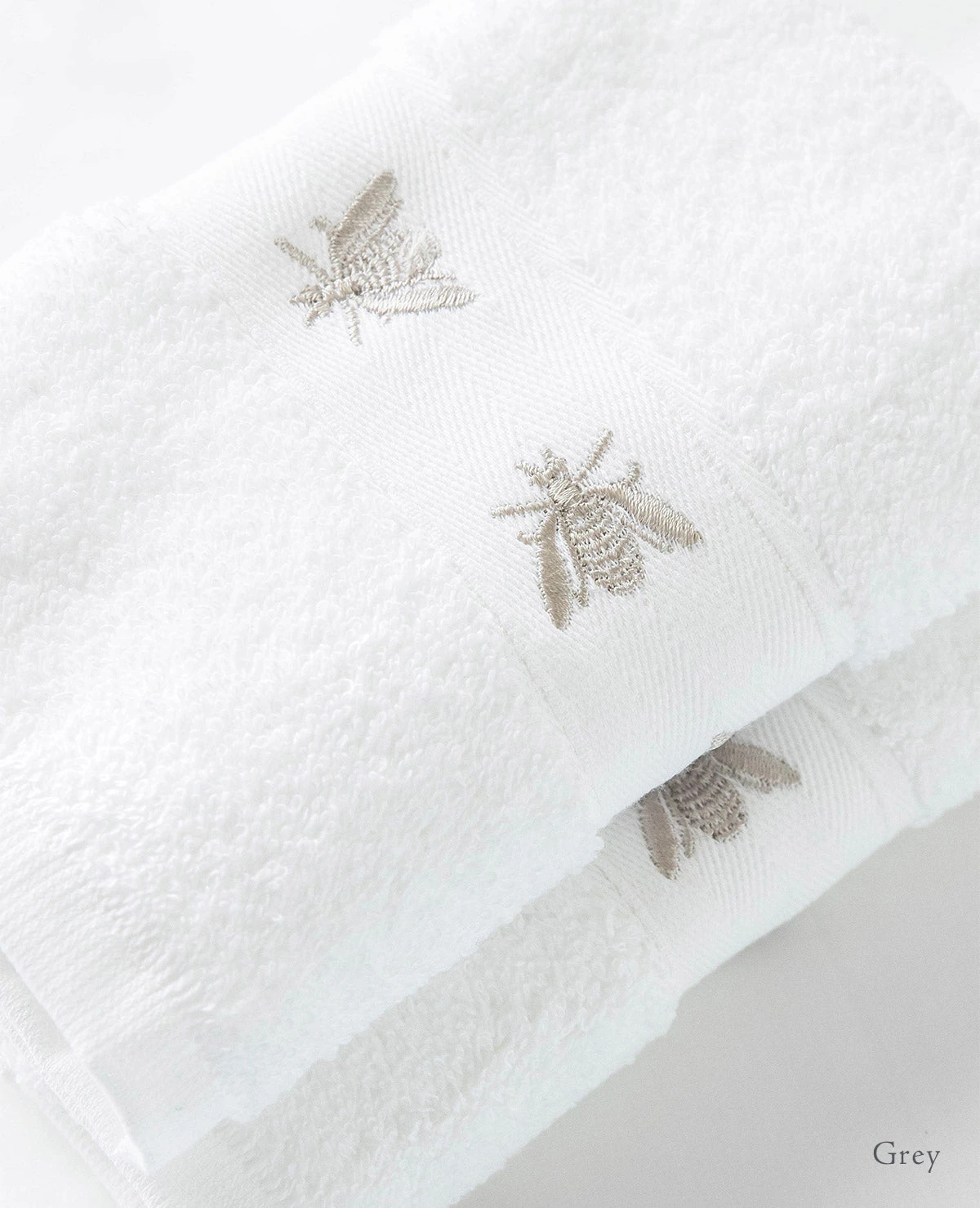 These stunning 100% cotton terry towels are embroidered with an iconic honeybee motif, perfect for adding a touch of elegance to any bathroom or powder room. Made in Portugal of 100% long staple cotton. Available in Grey, Swedish Blue, Taupe and Off-White on White Terry.