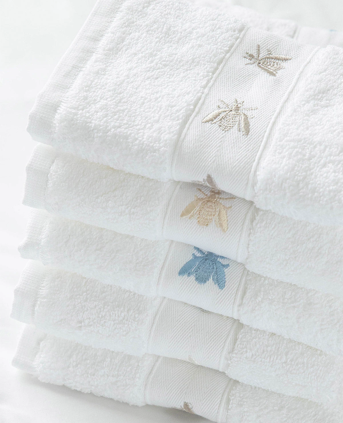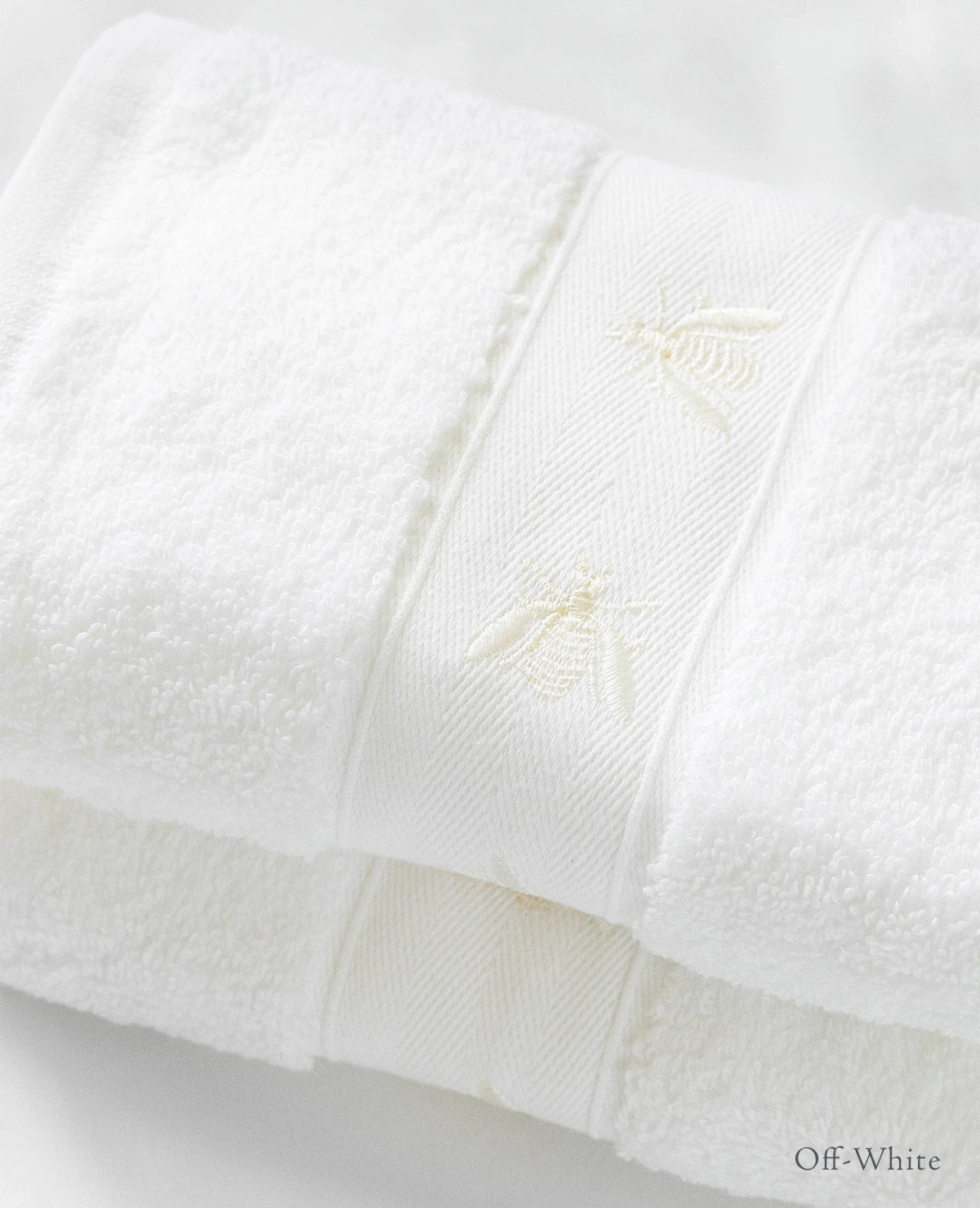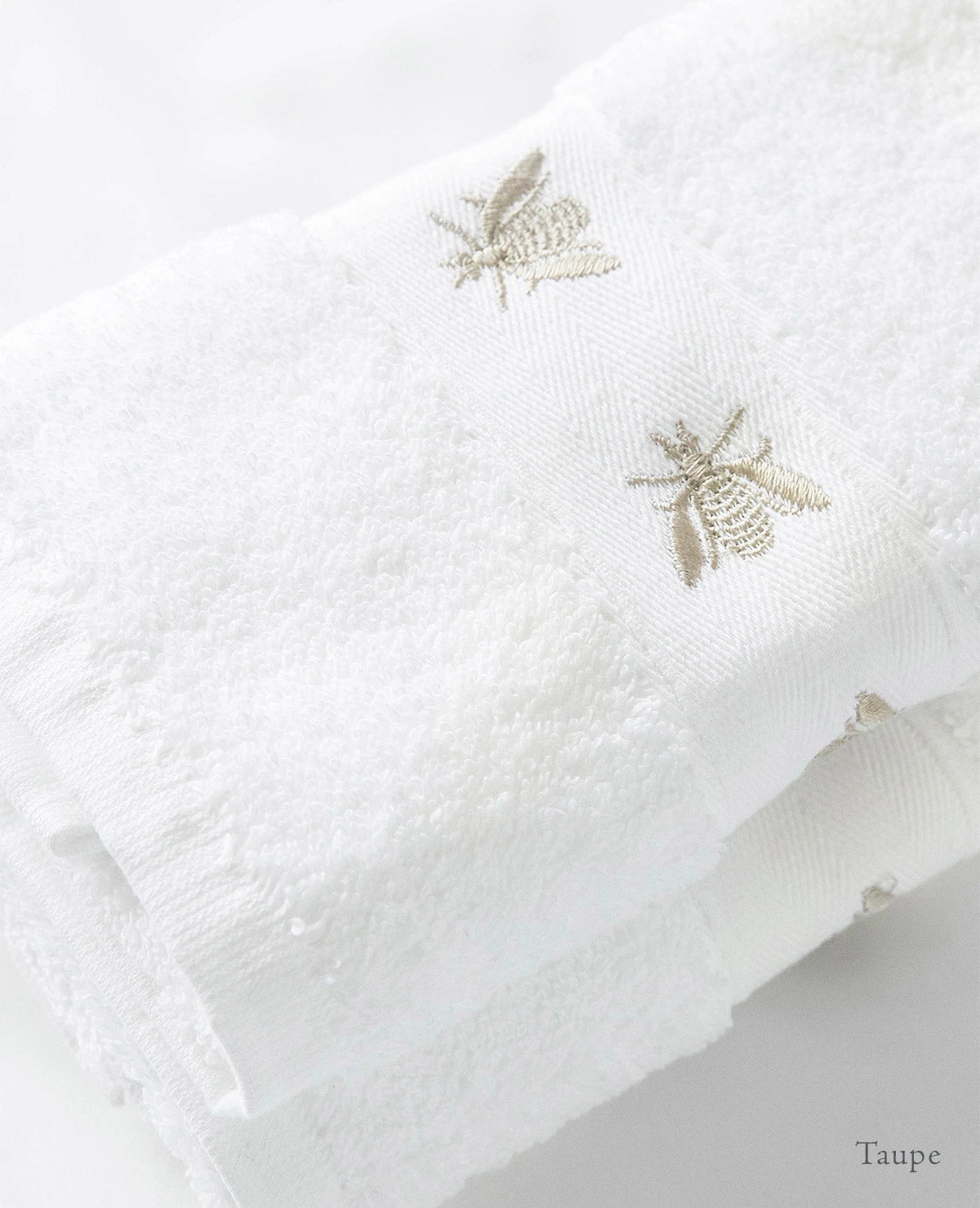 These stunning 100% cotton terry towels are embroidered with an iconic honeybee motif, perfect for adding a touch of elegance to any bathroom or powder room. Made in Portugal of 100% long staple cotton. Available in Grey, Swedish Blue, Taupe and Off-White on White Terry.