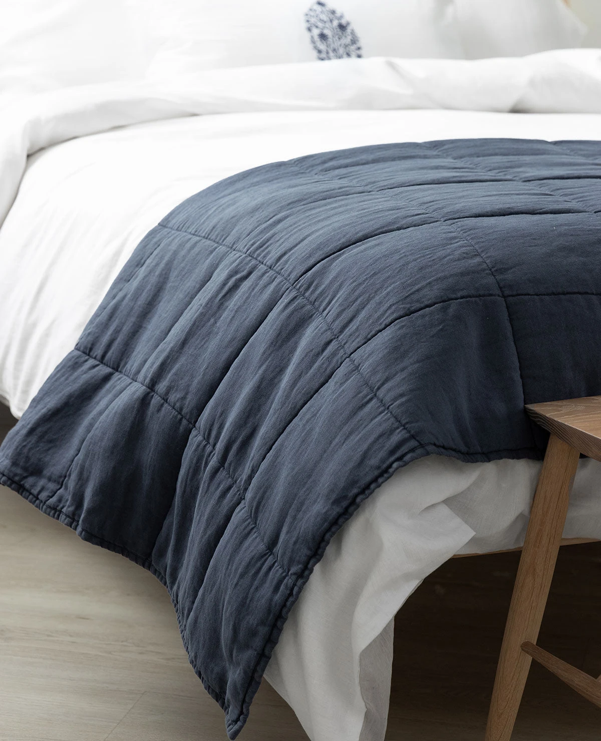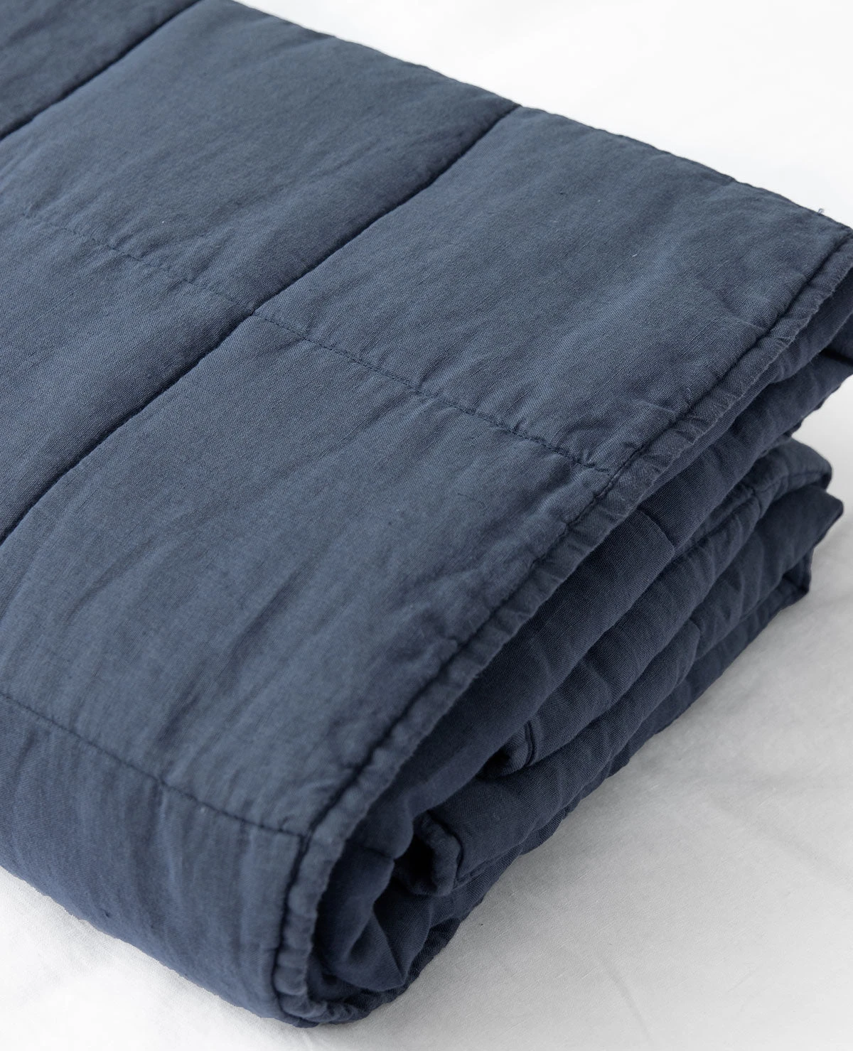 The lightweight quilt has a clean, simple box quilted pattern made of 100% linen. The perfect weight and style for year-round comfort and beauty.