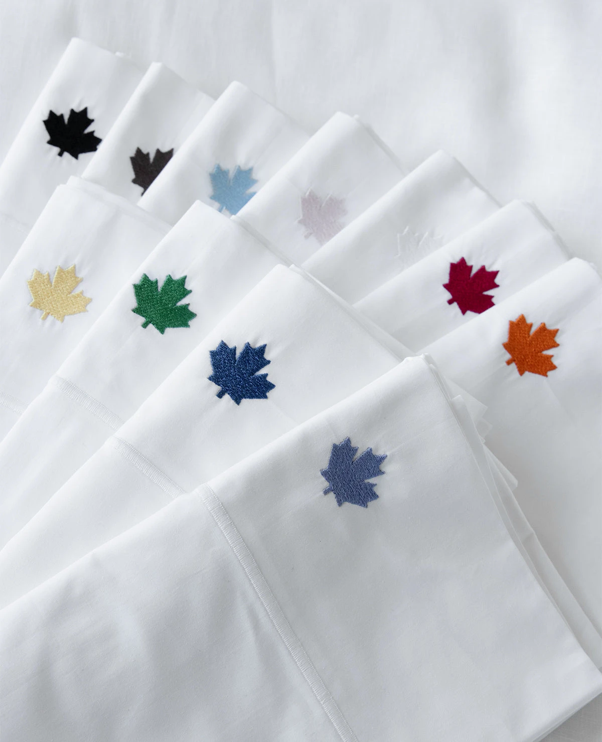 We’ve expanded our classic Maple Leaf Embroidered Collection to include a wide range of colours, representative of the richness and diversity of the identities that make up the fabric of Canada. Au Lit celebrates & supports all members of the 2SLGBTQIA+ community and is proud to donate a portion of all sales of our Canadian Pride collection to Egale, an organization committed to improving the lives of 2SLGBTQIA+ people in Canada and around the world. Select your embroidery colour from a rainbow of options and we will custom-make your pillowcases on our bestselling cool & crisp 220 Thread Count Egyptian Cotton Percale. Proudly sewn & embroidered in Canada.