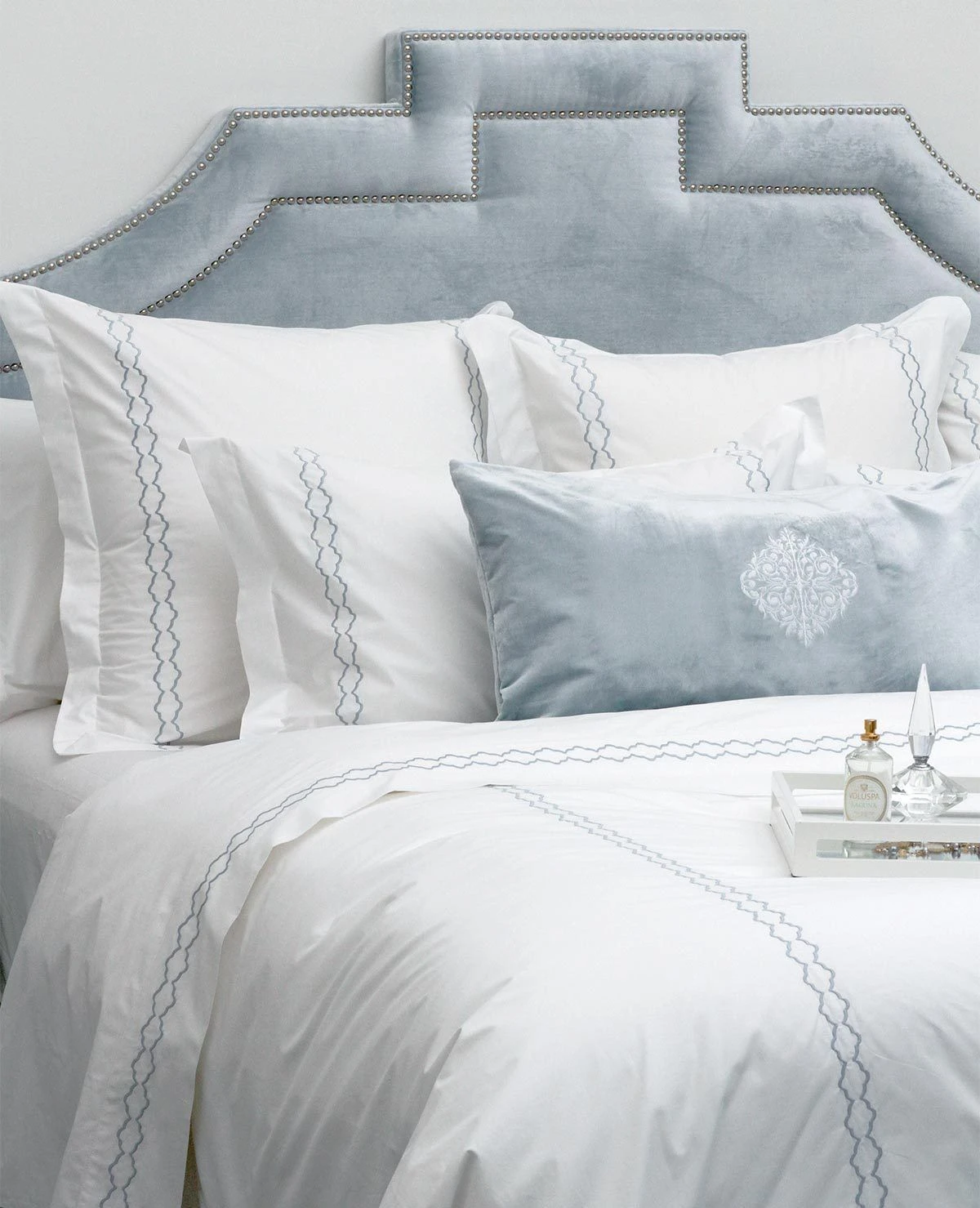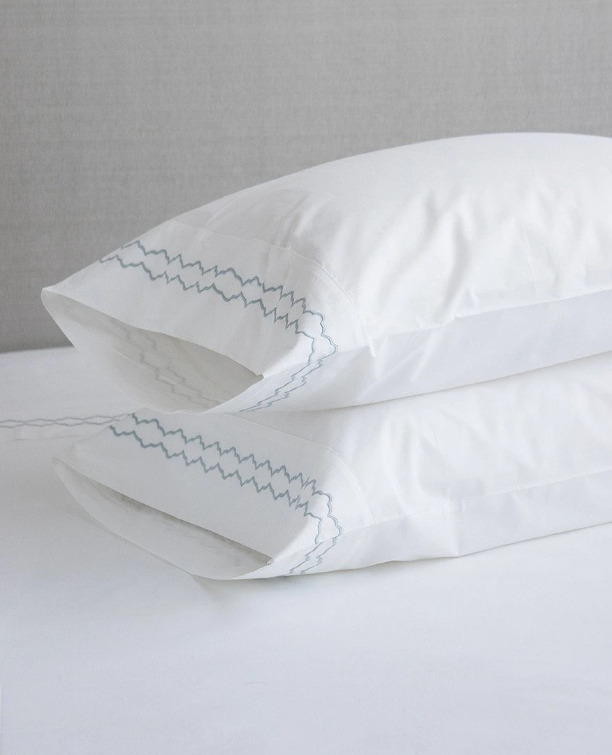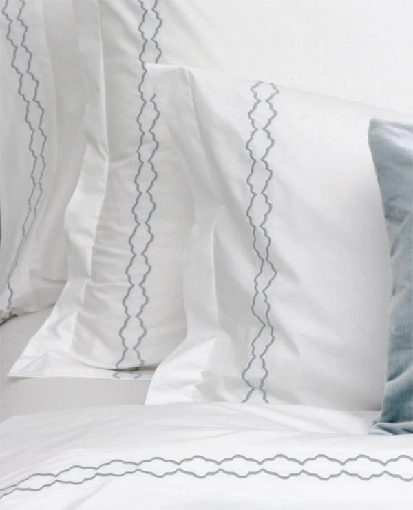 Our custom embroidered collections are proudly made-to-order at our Montreal workroom in the fabric and stitch colour of your choosing. Our Chloe collection is a fresh twist on our Scallop sheets. This feminine, more intricate design is perfect for bringing a little colour to your bed.