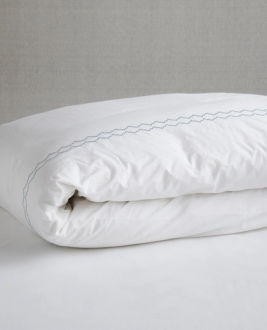 - Duvet covers are piped and have a side zipper closure.
