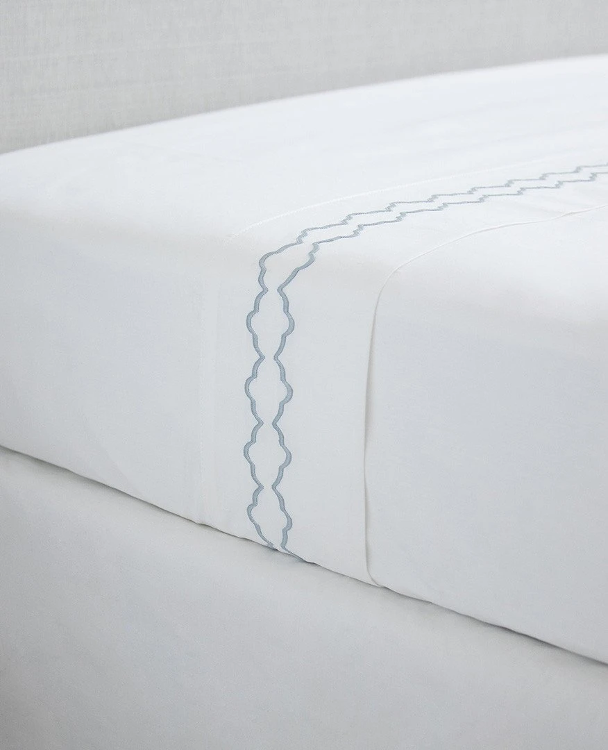 Our custom embroidered collections are proudly made-to-order at our Montreal workroom in the fabric and stitch colour of your choosing. Our Chloe collection is a fresh twist on our Scallop sheets. This feminine, more intricate design is perfect for bringing a little colour to your bed. Newly available on our top-selling 410 thread count percale! At once crisp & buttery soft, customize your 410 percale bedding with a selection of 20+ unique stitch colours in our beautiful Chloe design.
