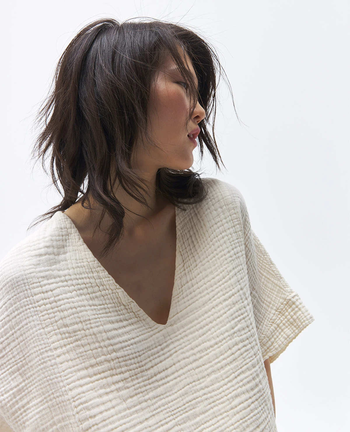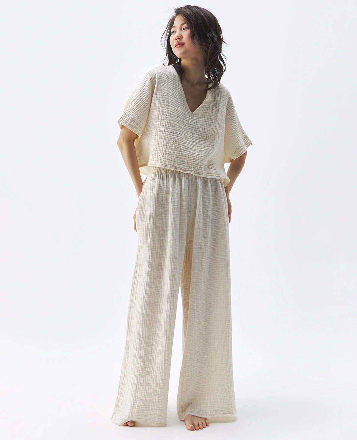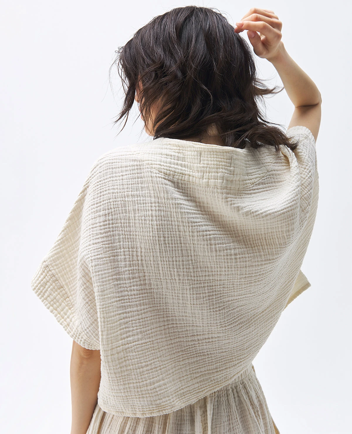 Made with a luxe fabric composed of doubled Turkish muslin cotton. The crinkle muslin texture is incredibly lightweight and soft on the skin. Designed in an oversized style, the Crinkle Crop Top has half sleeves, with a cropped cut at the waist, and a V neckline. Sustainable and responsibly made in Turkey exclusively for Pokoloko.
