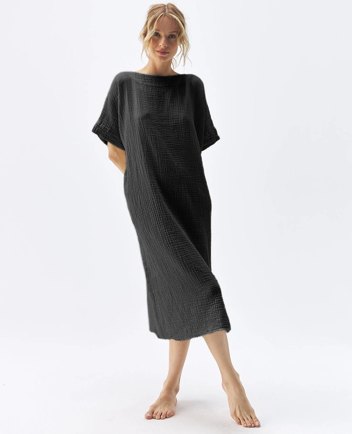 Made with a luxe fabric composed of doubled Turkish muslin cotton. The crinkle muslin texture is incredibly lightweight and soft on the skin. Designed in an oversized style, the Crinkle Kaftan is a short-sleeve ballon dress that falls mid-calf to ankle. Sustainable and responsibly made in Turkey exclusively for Pokoloko.
