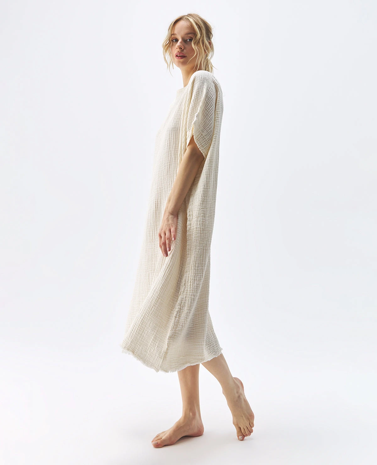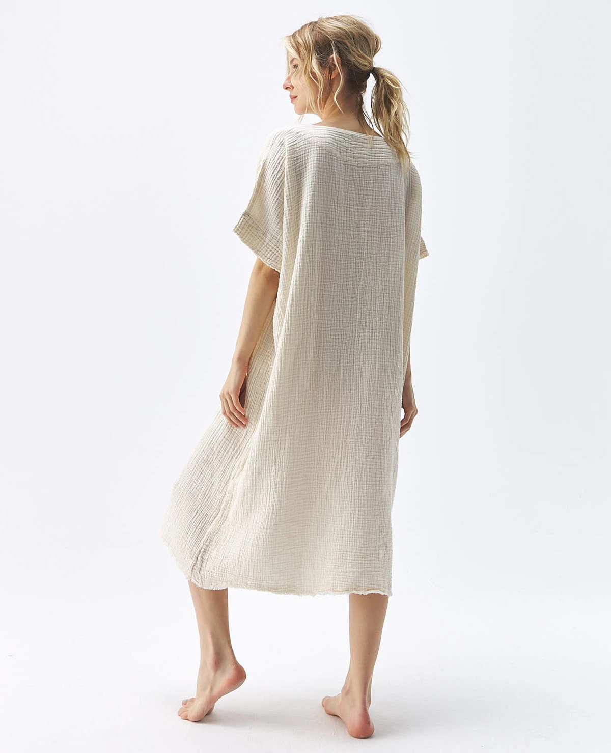 Made with a luxe fabric composed of doubled Turkish muslin cotton. The crinkle muslin texture is incredibly lightweight and soft on the skin. Designed in an oversized style, the Crinkle Kaftan is a short-sleeve ballon dress that falls mid-calf to ankle. Sustainable and responsibly made in Turkey exclusively for Pokoloko.