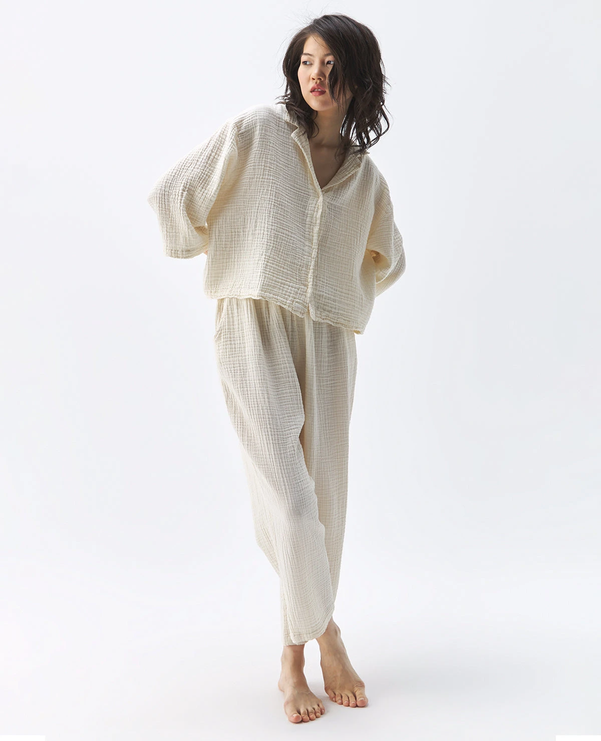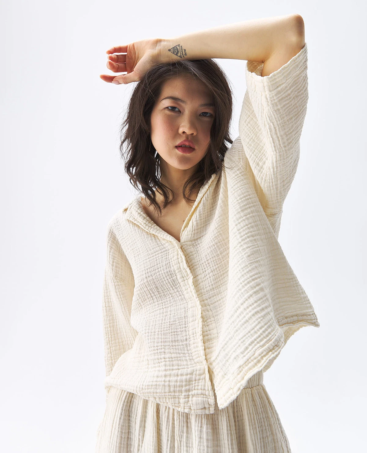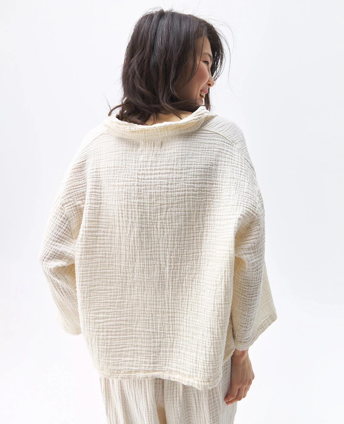 Made with a luxe fabric composed of doubled Turkish muslin cotton. The crinkle muslin texture is incredibly lightweight and soft on the skin. Designed in an oversized style, the Crinkle Shirt Blouse has collar and buttons like a classic PJ top or button-down, and can be worn as a PJ top or shirt. Sustainable and responsibly made in Turkey exclusively for Pokoloko. This item is on backorder until March 2024. Pre-orders welcome!