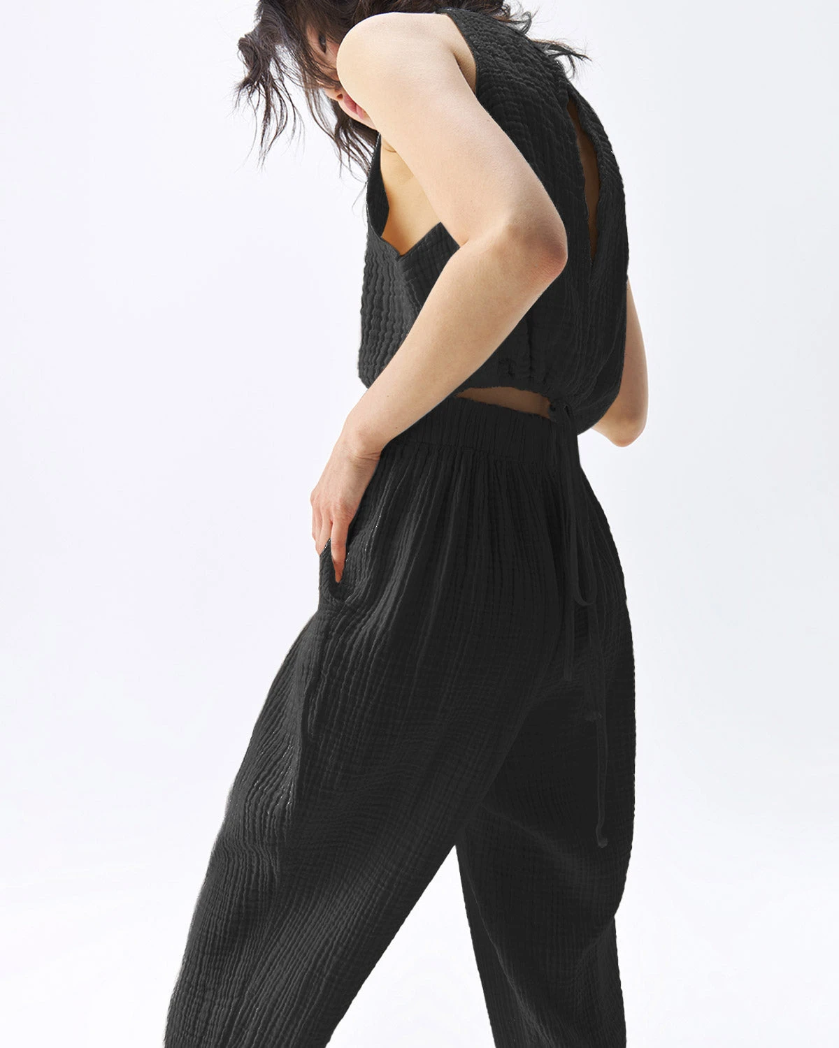 Made with a luxe fabric composed of doubled Turkish muslin cotton. The crinkle muslin texture is incredibly lightweight and soft on the skin. Designed in an oversized style, the Crinkle pants are high-waisted with a generous, comfortable elastic band waist and wide crop legs for a flowy look and feel. Sustainable and responsibly made in Turkey exclusively for Pokoloko.