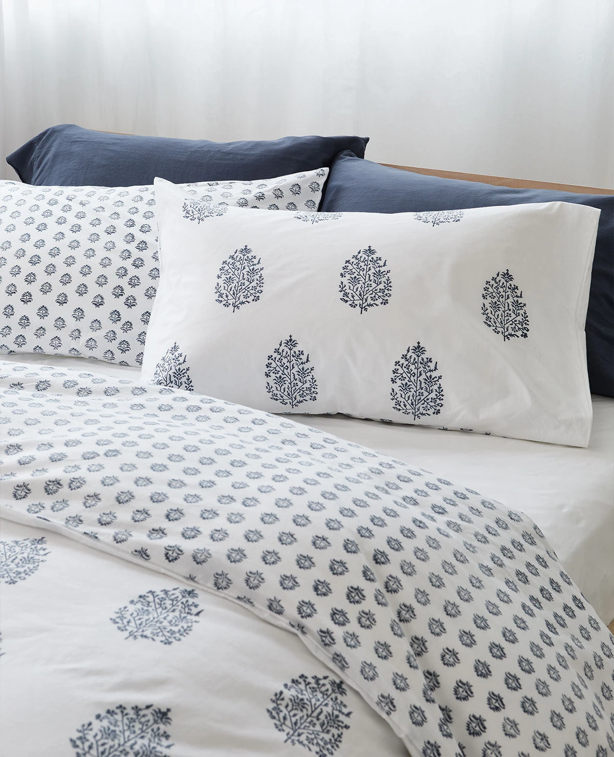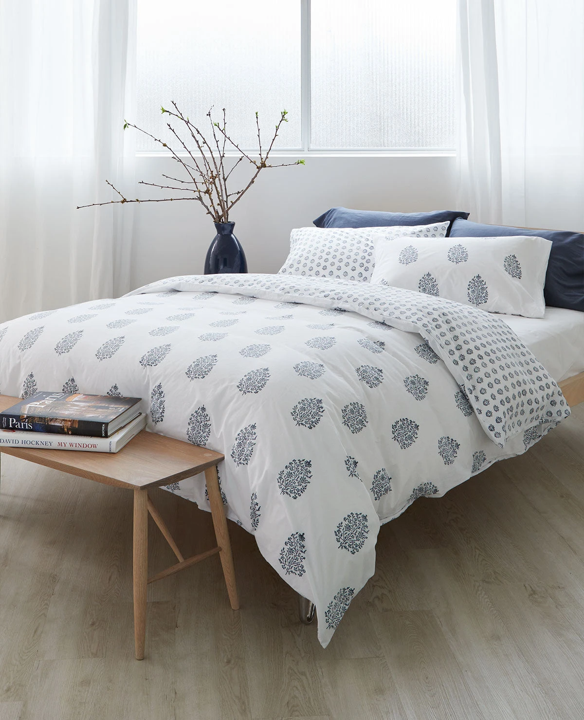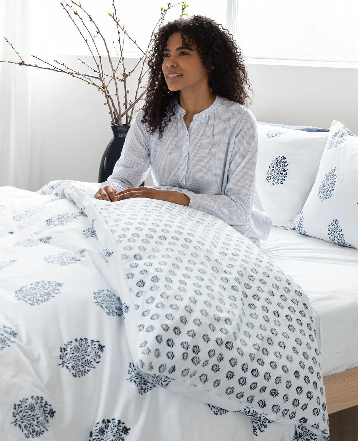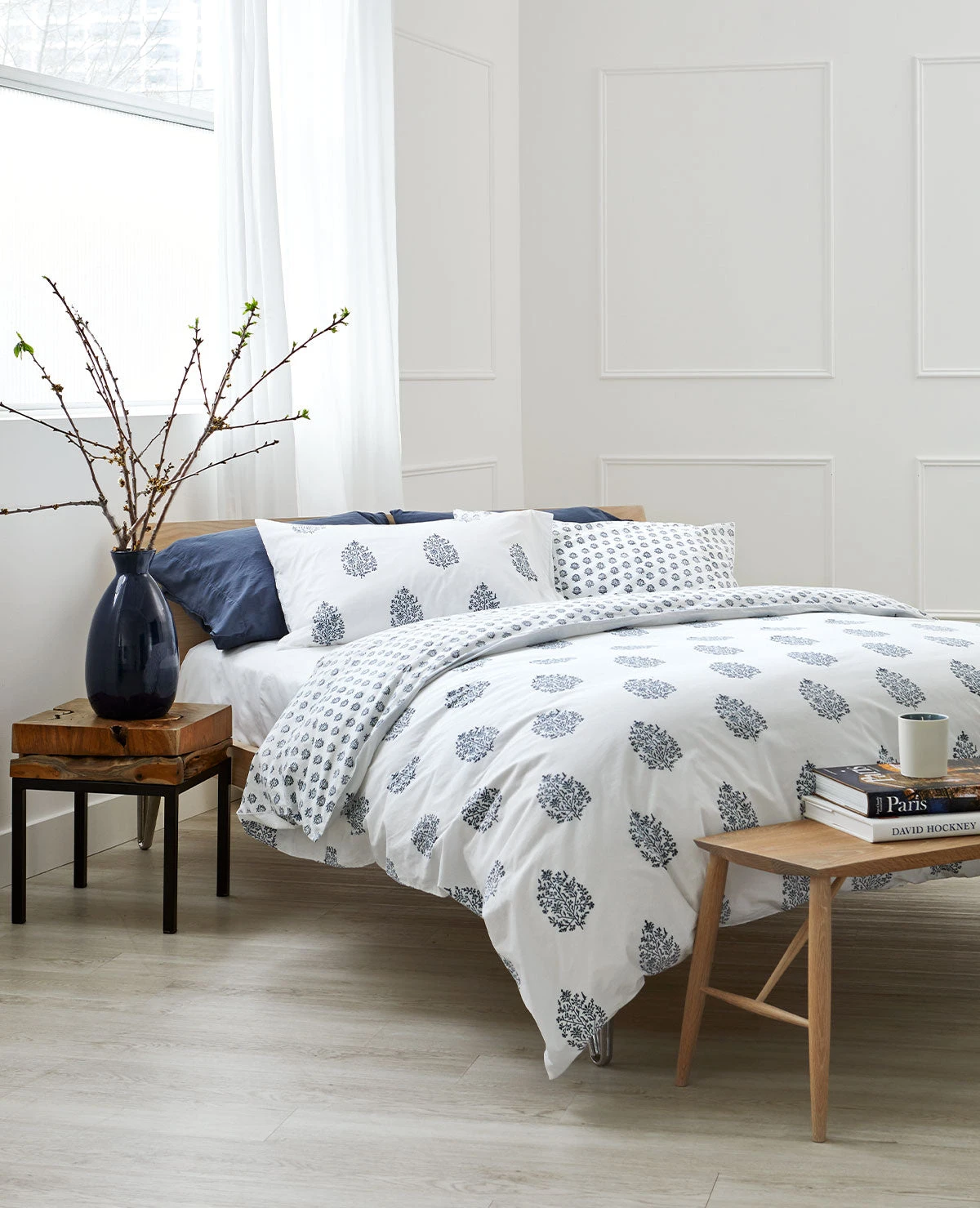 Bold & eclectic, this gorgeous design is printed on crisp, white cotton and reverses to a smaller print in rich Indigo. This collection is traditionally and authentically hand-blocked in India. The Cypress collection is fresh and clean and all pieces are completely reversible. Made in India with 100% cotton in a 200 thread count percale.