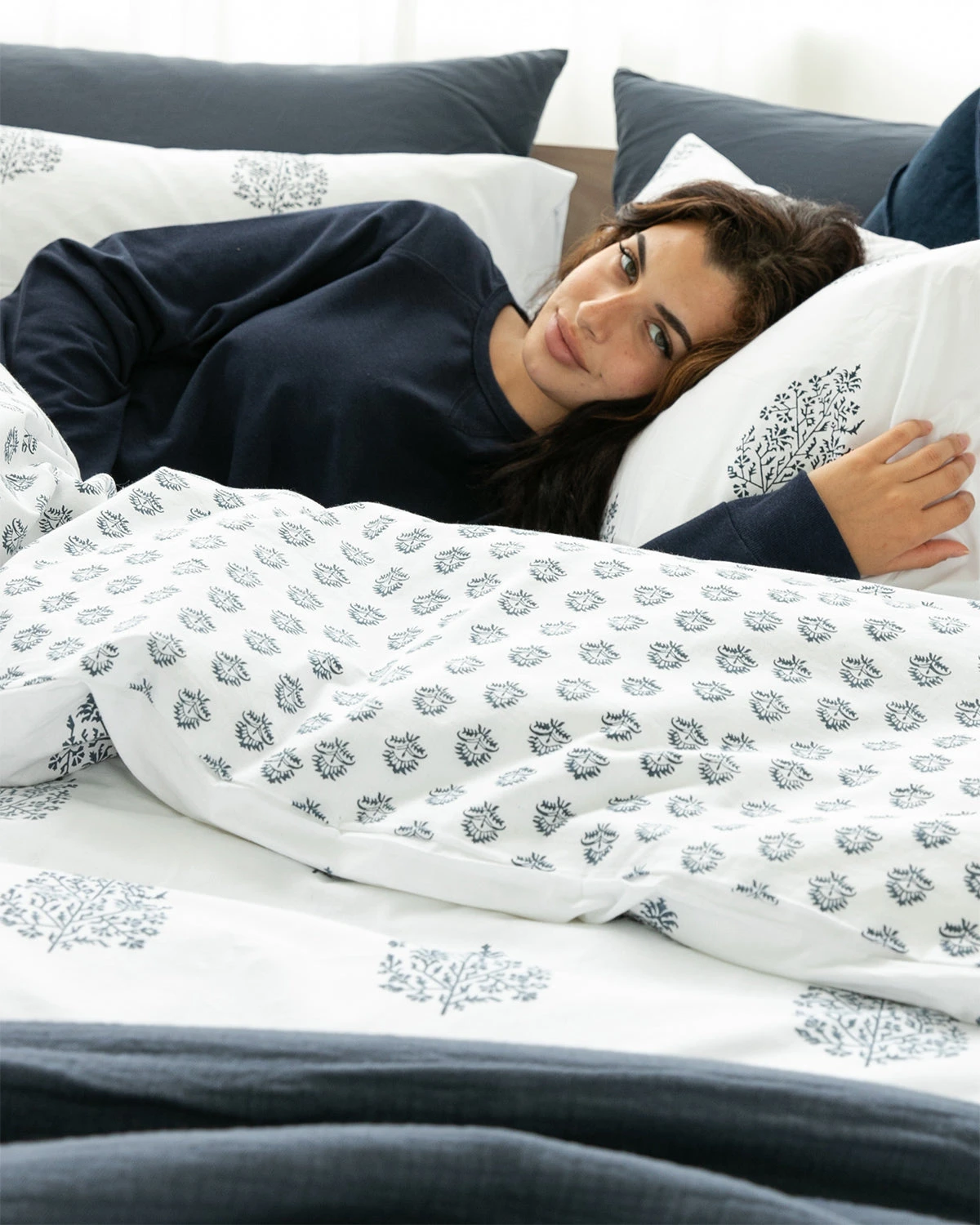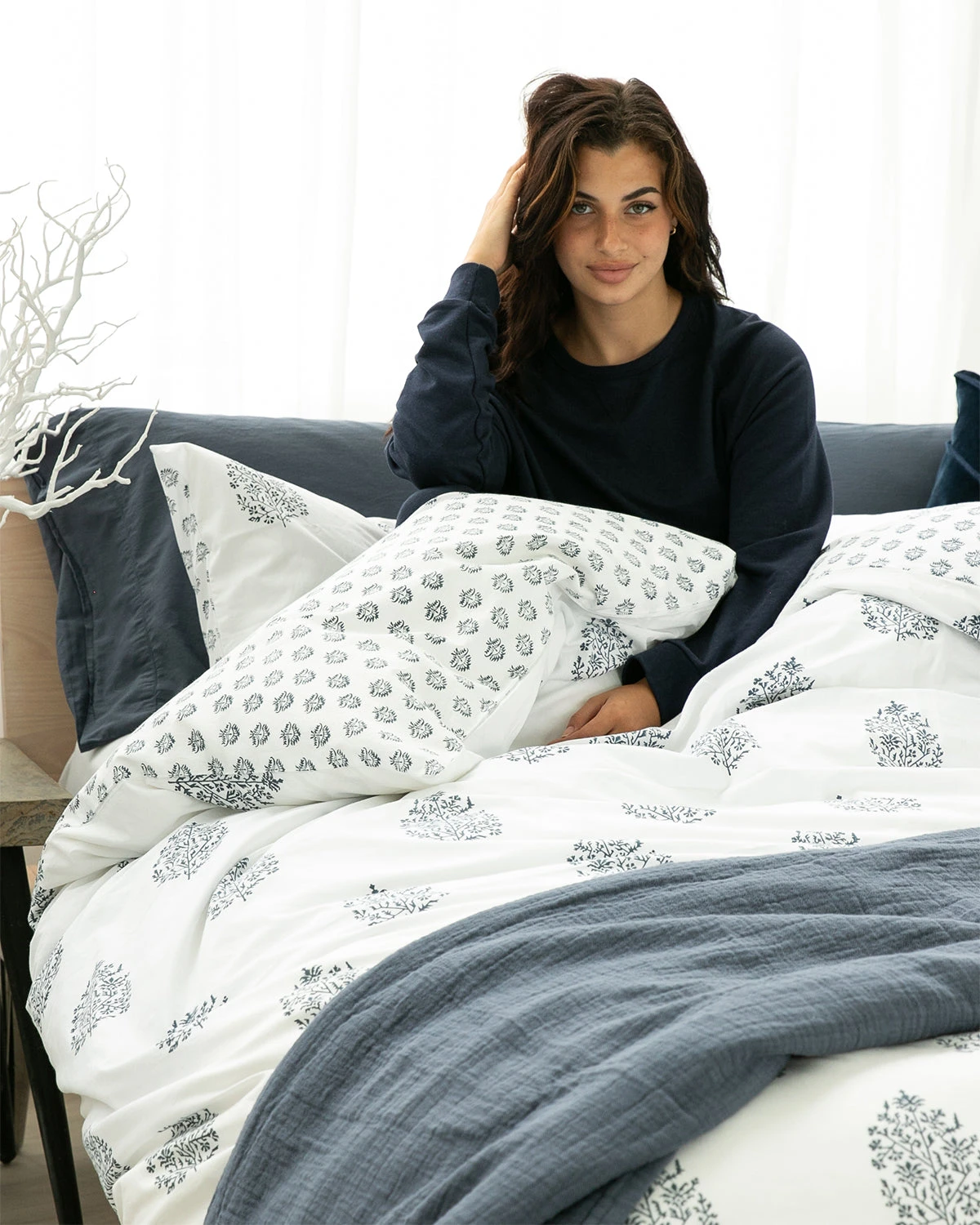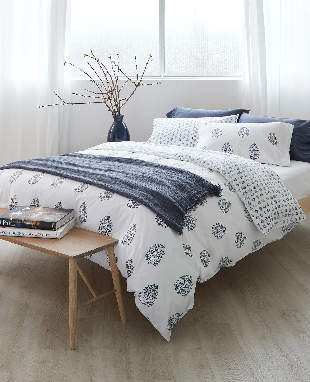 Bold & eclectic, this gorgeous design is printed on crisp, white cotton and reverses to a smaller print in rich Indigo. This collection is traditionally and authentically hand-blocked in India. The Cypress collection is fresh and clean and all pieces are completely reversible. Made in India with 100% cotton in a 200 thread count percale.
