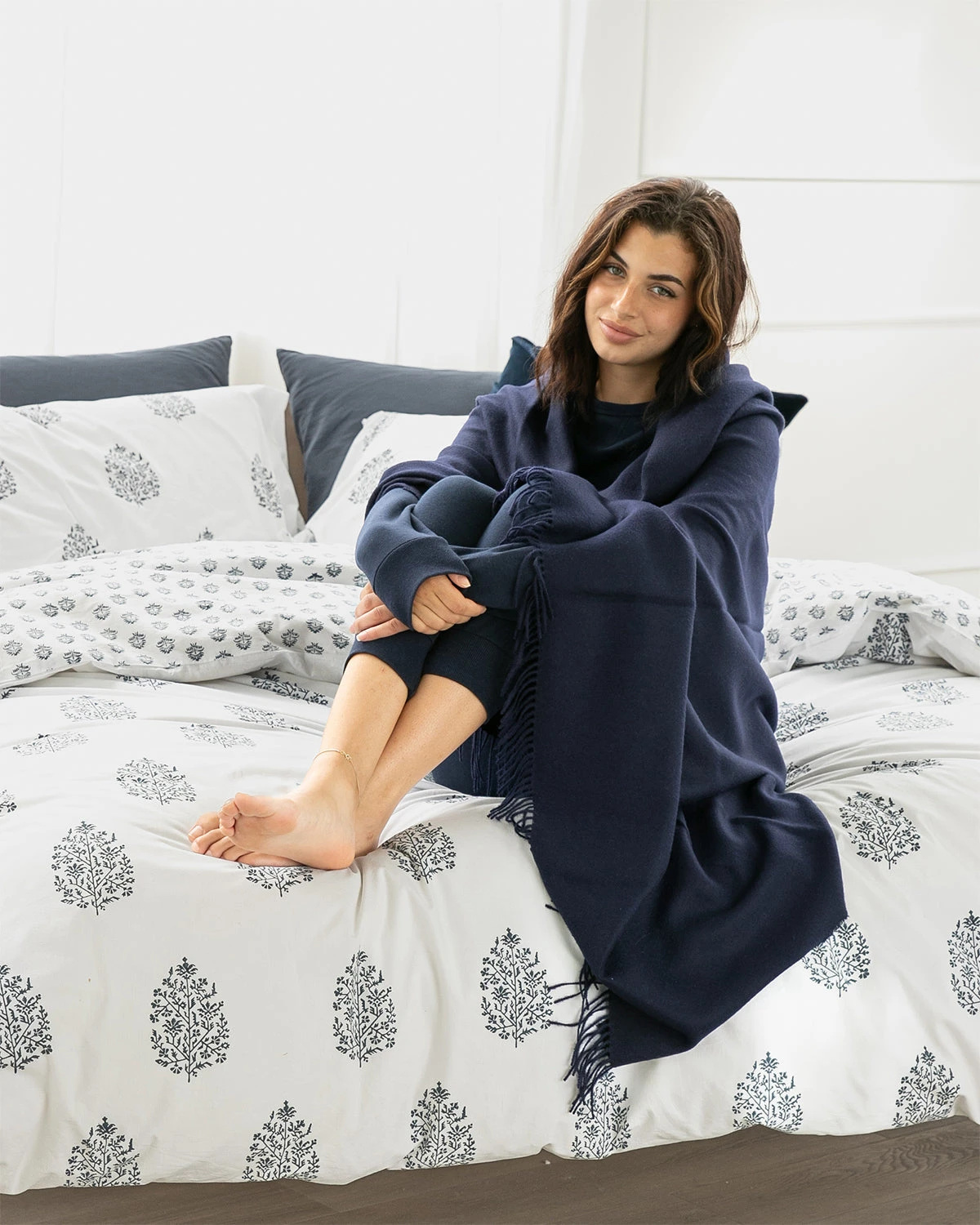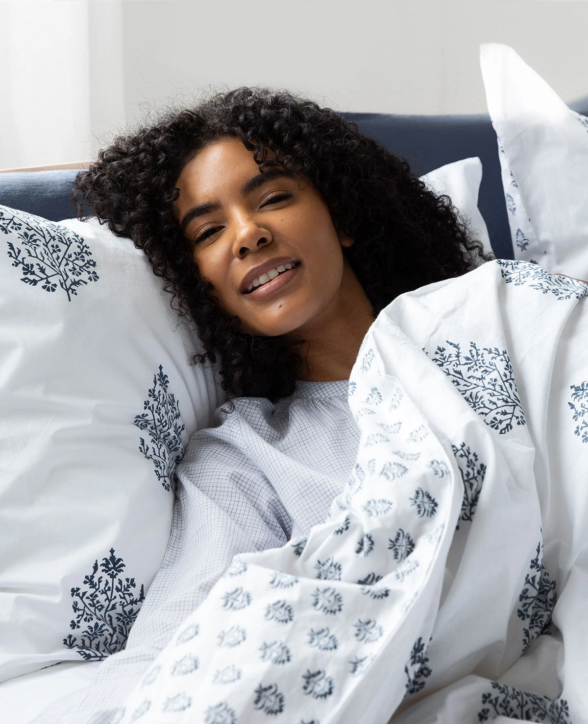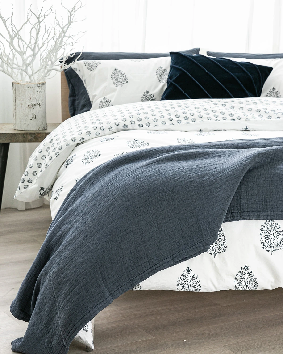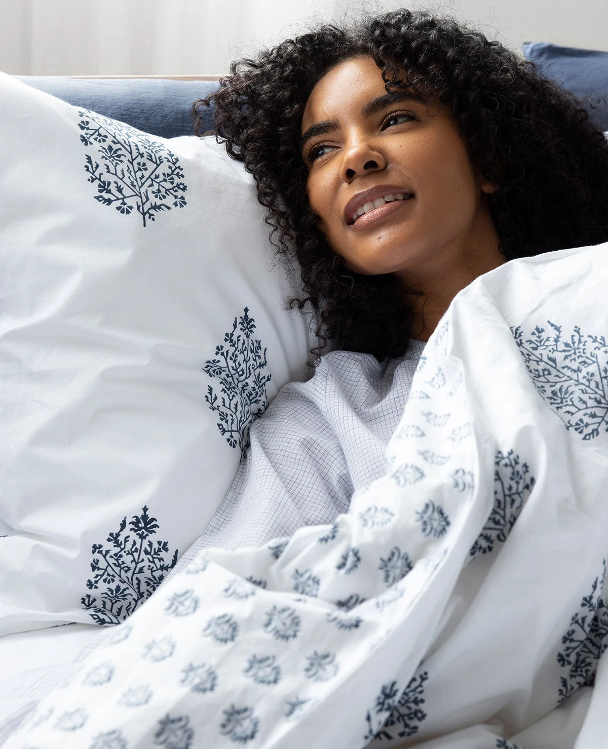 Bold & eclectic, this gorgeous design is printed on crisp, white cotton and reverses to a smaller print in rich Indigo. This collection is traditionally and authentically hand-blocked in India. The Cypress collection is fresh and clean and all pieces are completely reversible. Made in India with 100% cotton in a 200 thread count percale.