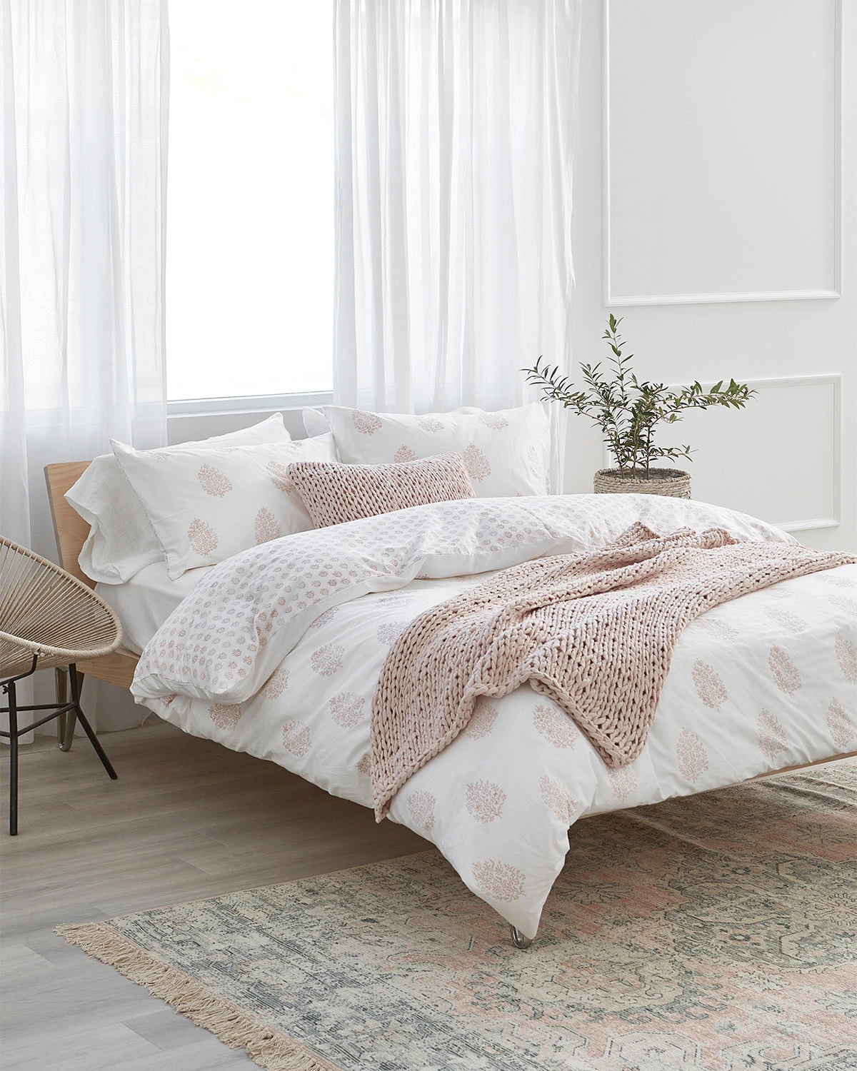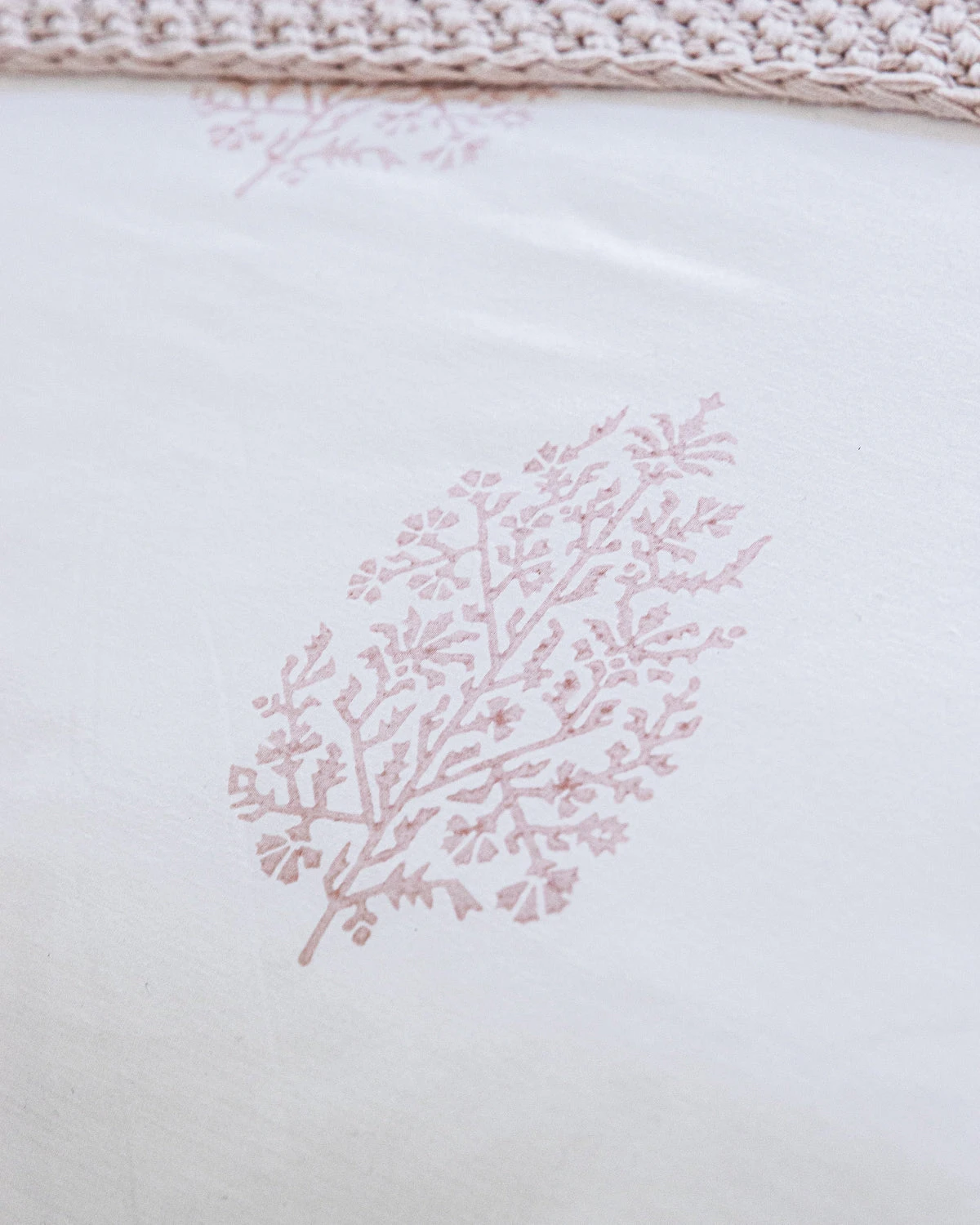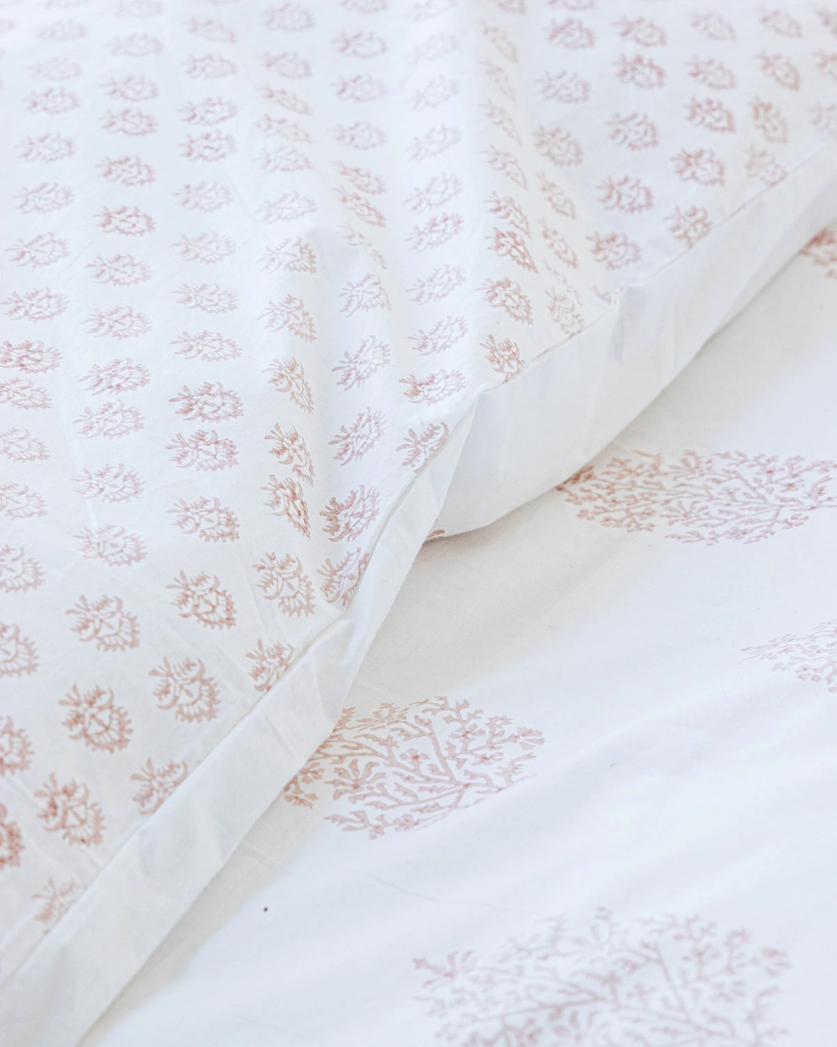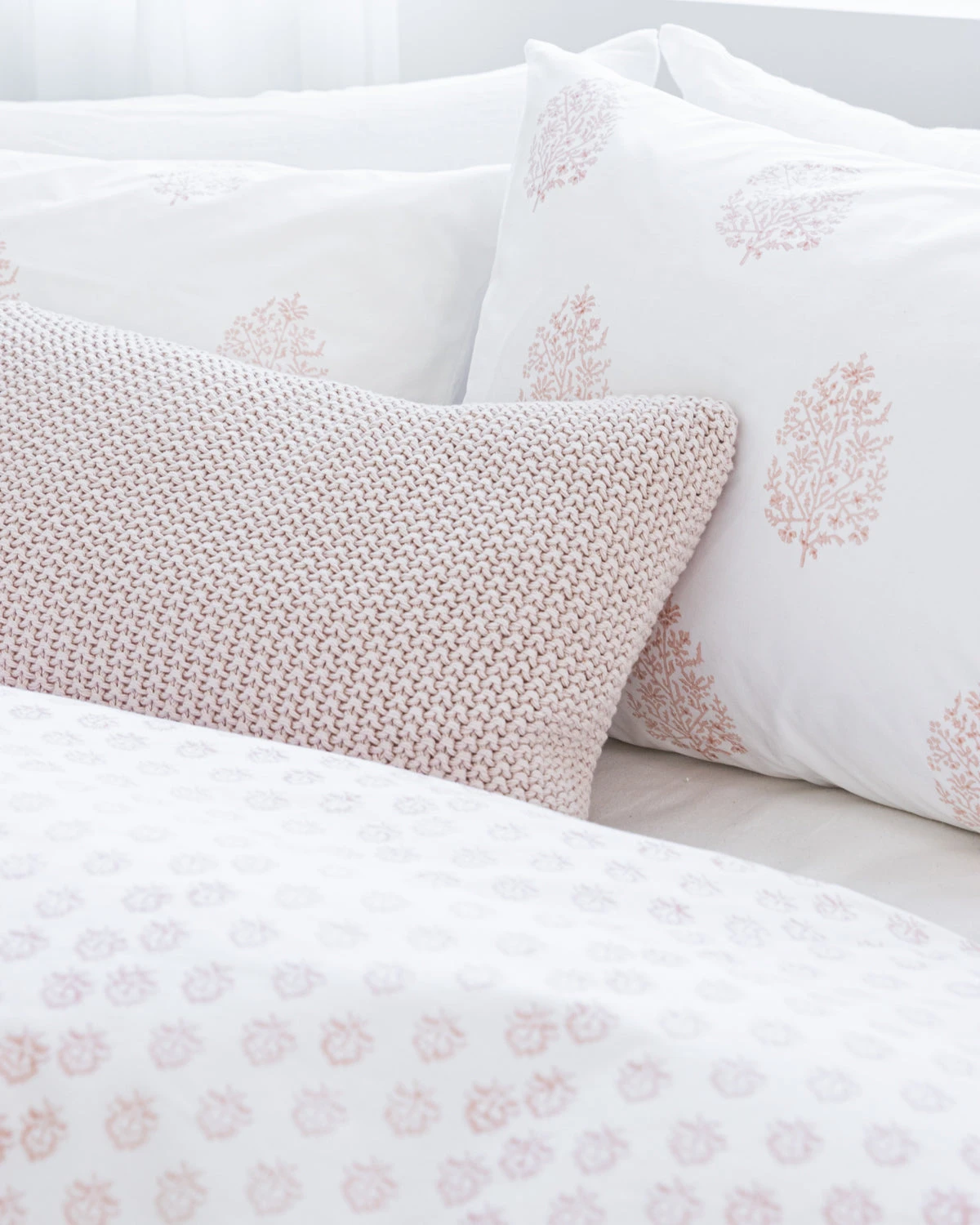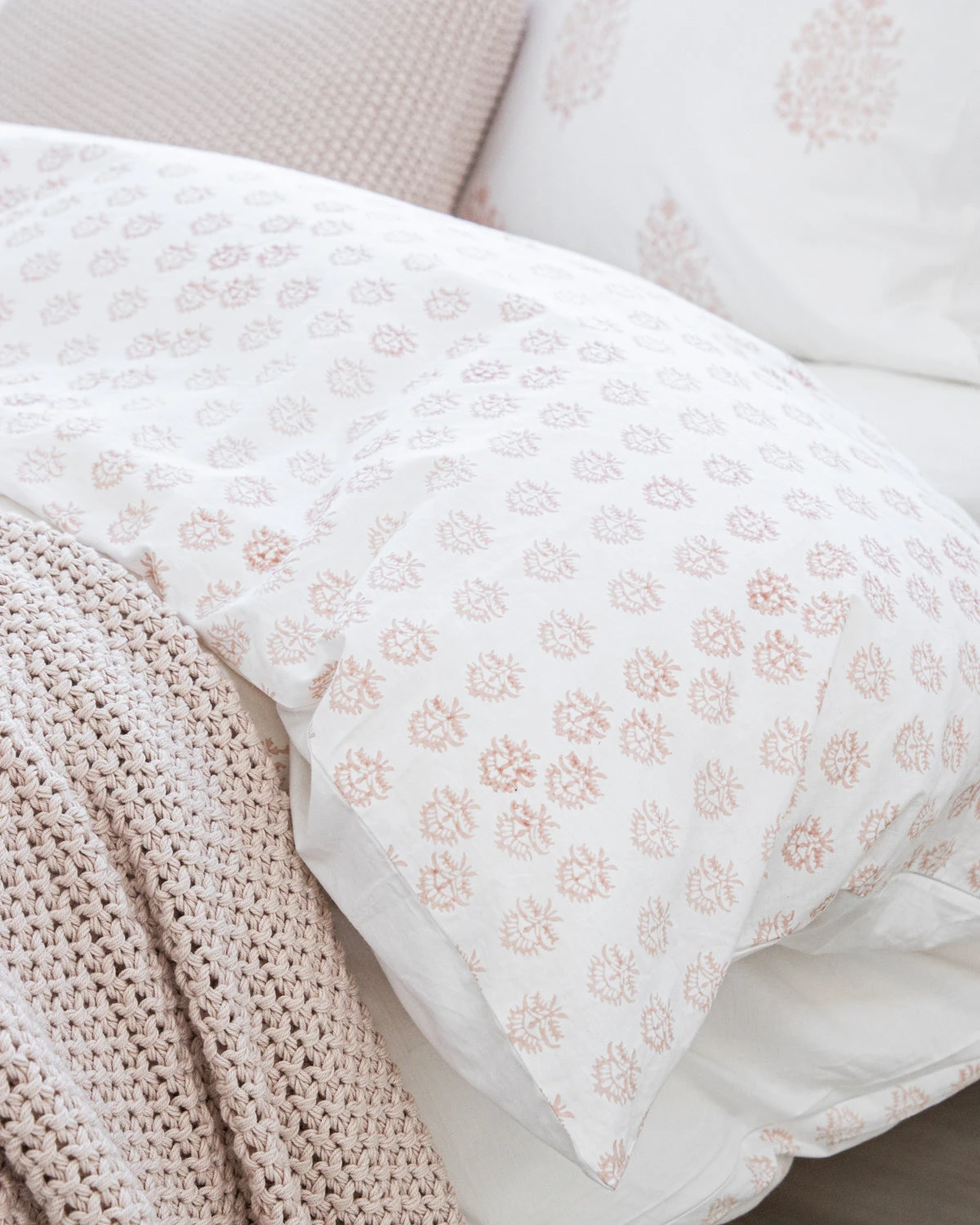 Pre-order for May! Soft & eclectic, this gorgeous design is printed on crisp, white cotton and reverses to a smaller print in feminine Ballet pink. This collection is traditionally and authentically hand-blocked in India. The Cypress collection is fresh and clean and all pieces are completely reversible. Made in India with 100% cotton in a 200 thread count percale.