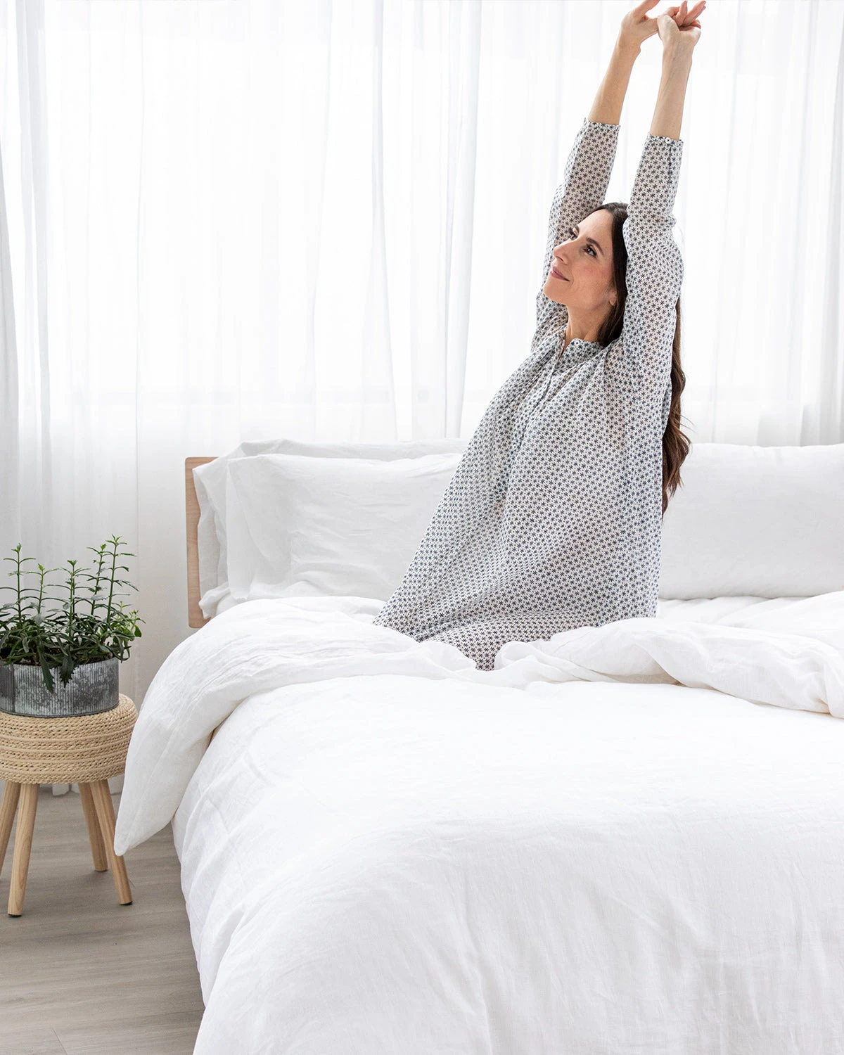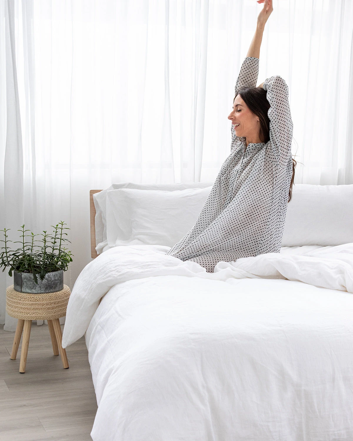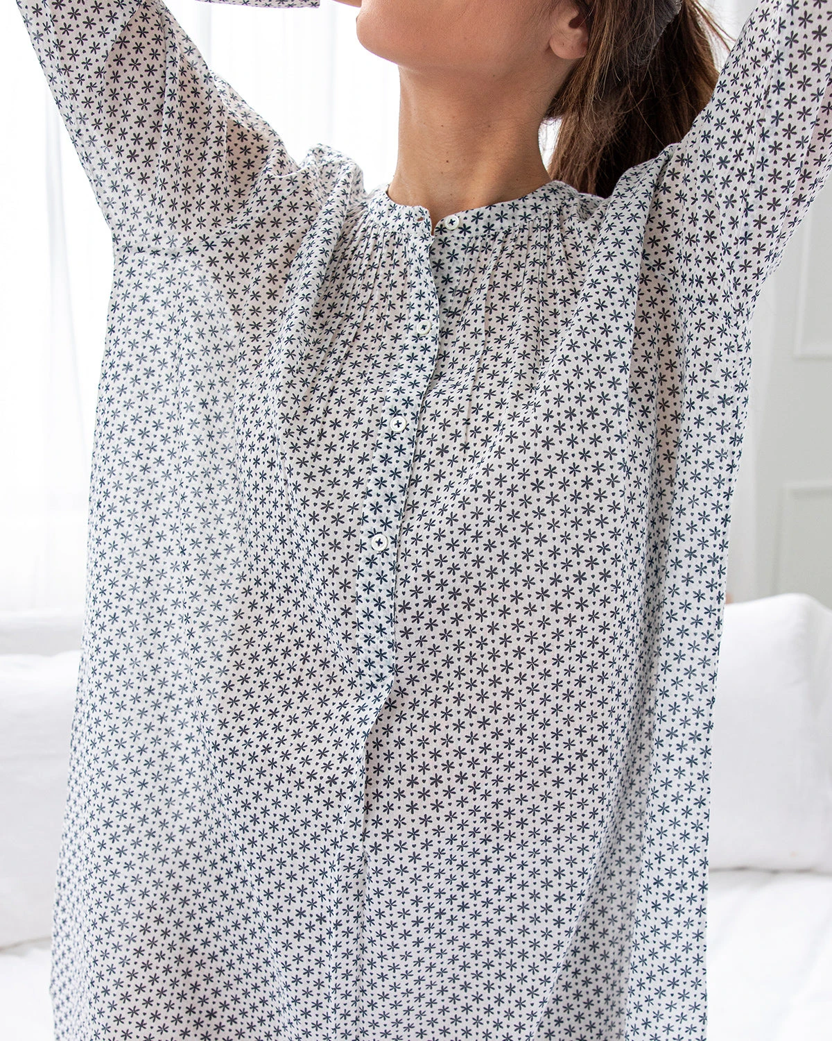 This knee-length cotton sleep shirt is designed in Paris and handwoven in India. Featuring long sleeves and a buttons at the front, this loose-fitting nightdress is made for fresh summer nights with the windows open.