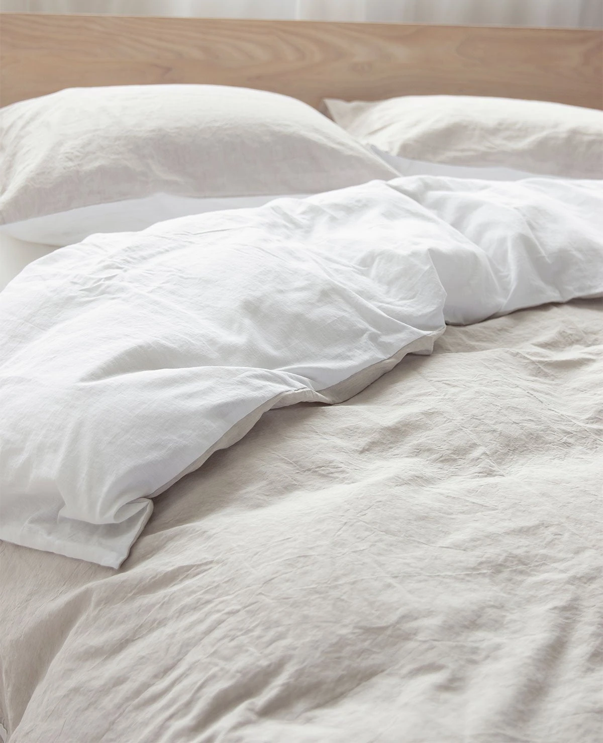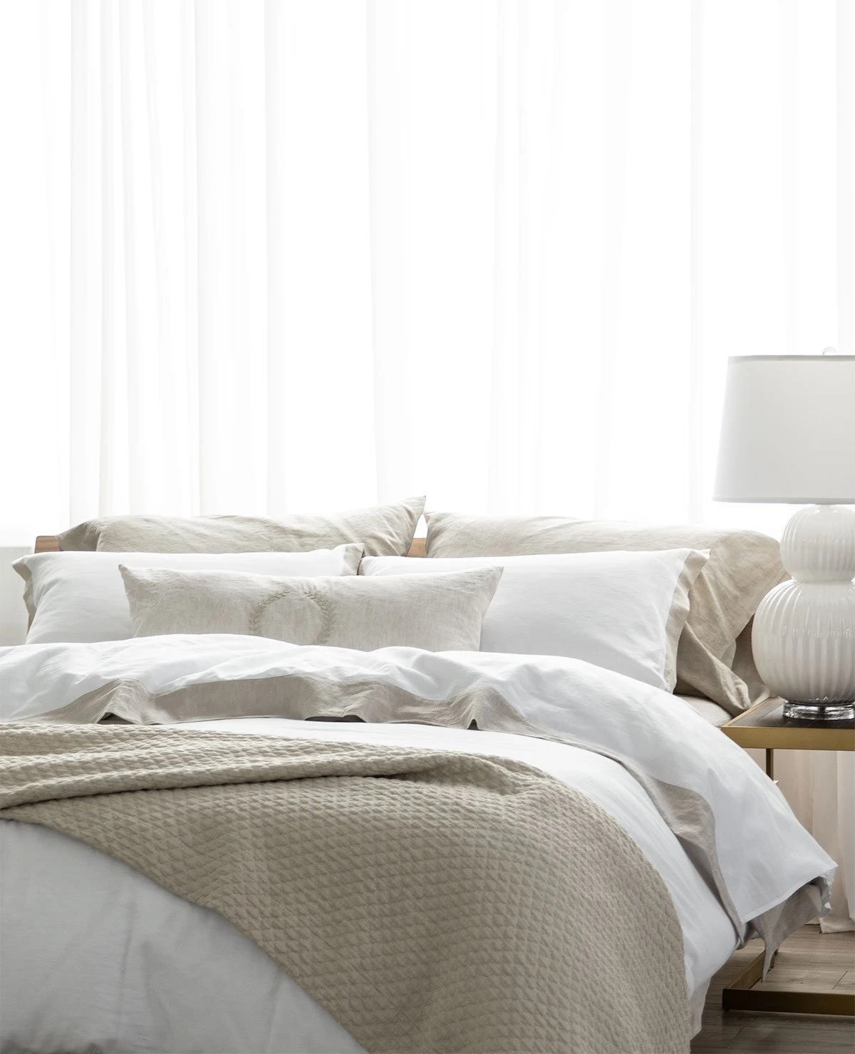 The Duet Linen collection is made of a 50/50 blend of long-staple cotton and Italian linen, giving the fabric the wonderful look and texture of linen, with the soft hand of cotton. Duet duvet covers reverse Flax to White. Pillow cases are reversible White to Flax.