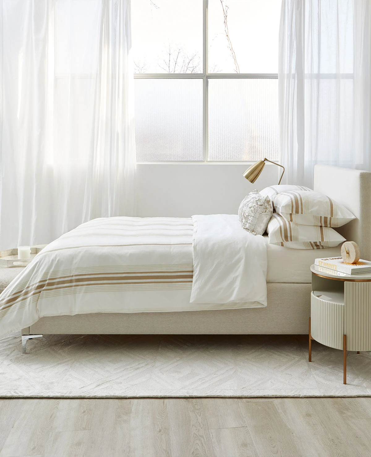 Our Gabriele cotton sateen is a modern stripe in warm hues of Dune, Cream and Milk (Off-white), woven in Italy from the finest quality 320-thread count, 100% Egyptian cotton. This stunning contemporary design is marvellously versatile.