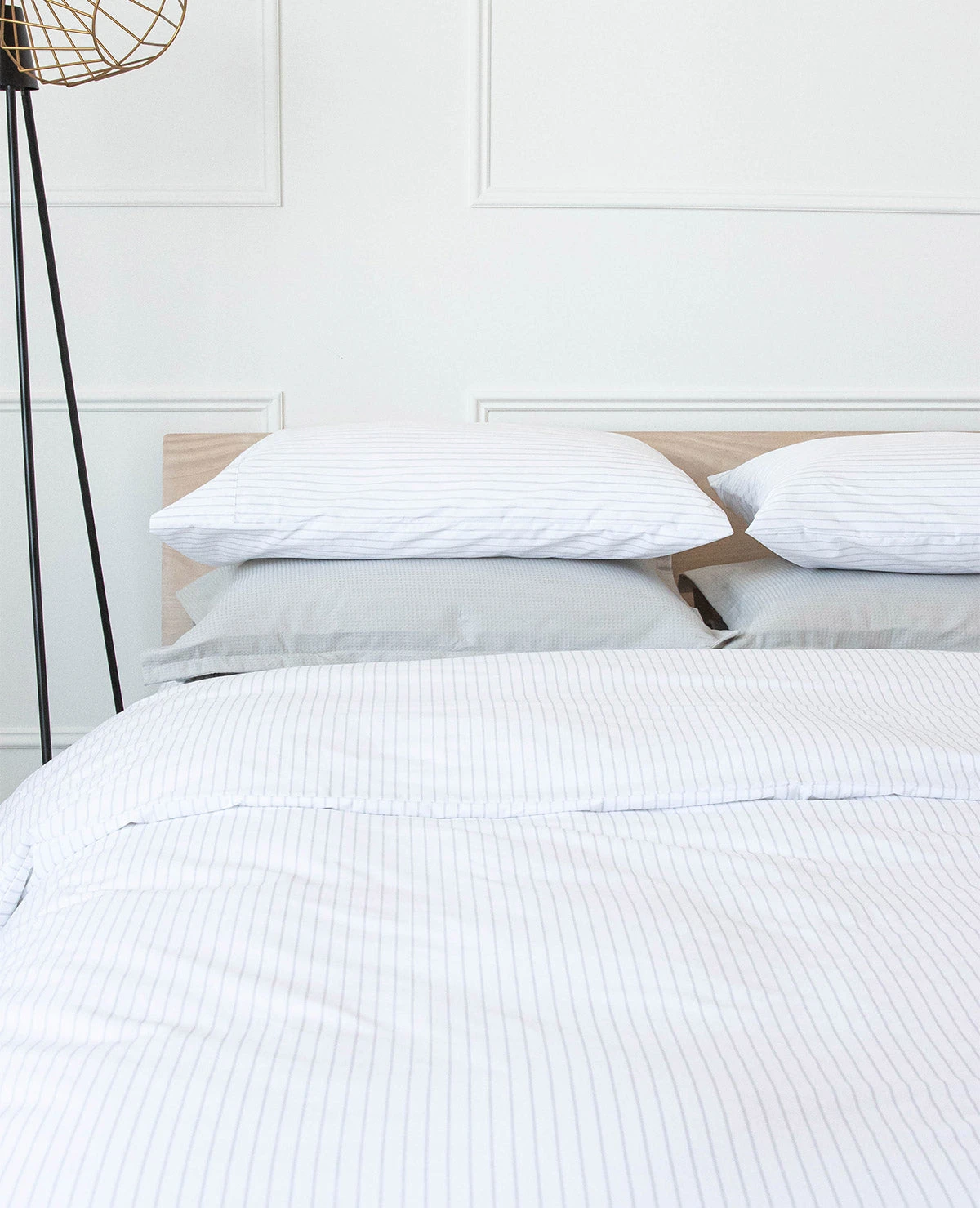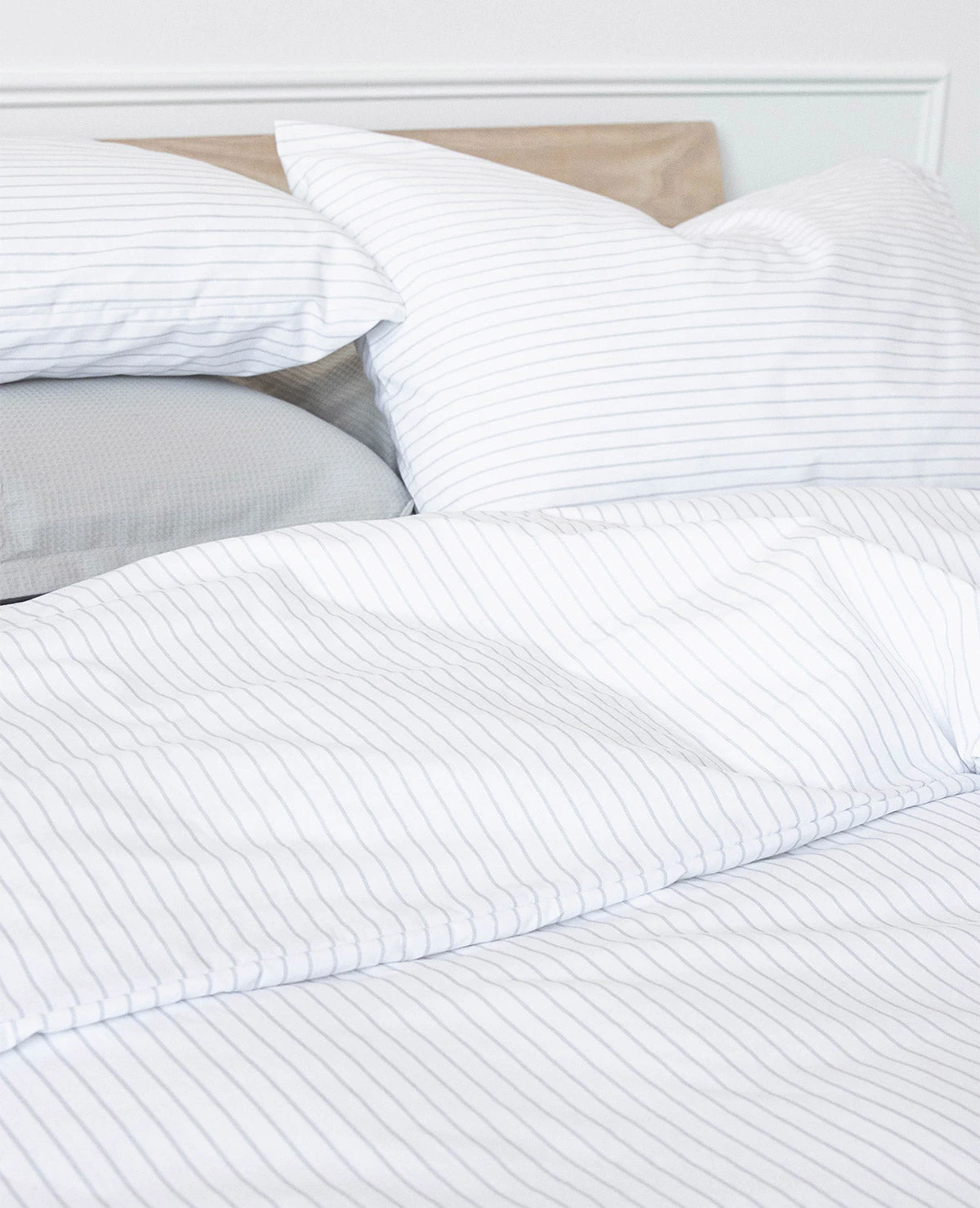 Georgia Grey is a classic stripe print made of 220 thread count long-staple cotton, woven in Portugal and made in Canada. Georgia is timeless and versatile, lending itself to a contemporary or more youthful style of bed. A perfect coordinate with our Chambray collection. *Please note that Jumbo Queen and King sized fitted sheets in this collection will feature a horizontal stripe rather than vertical.