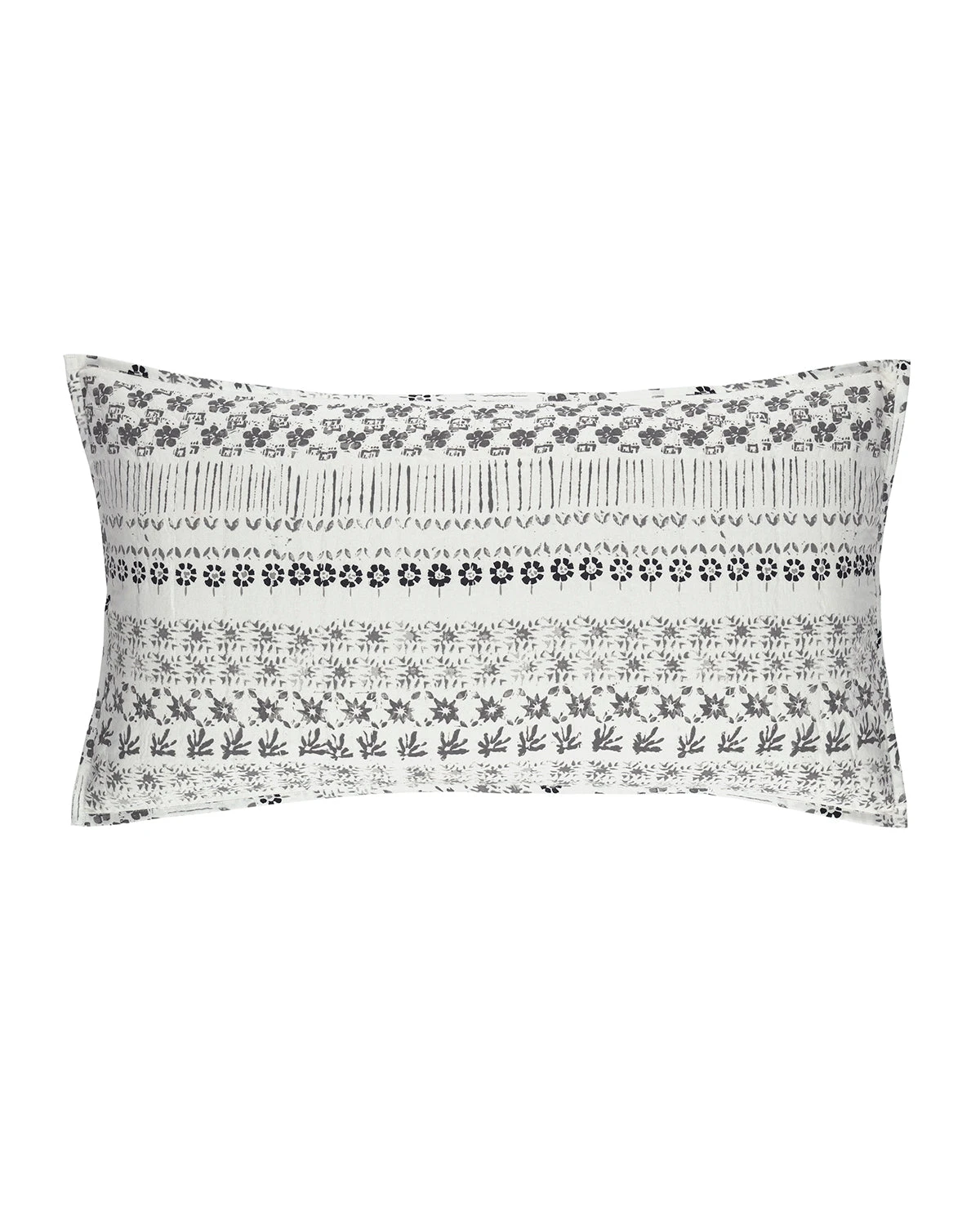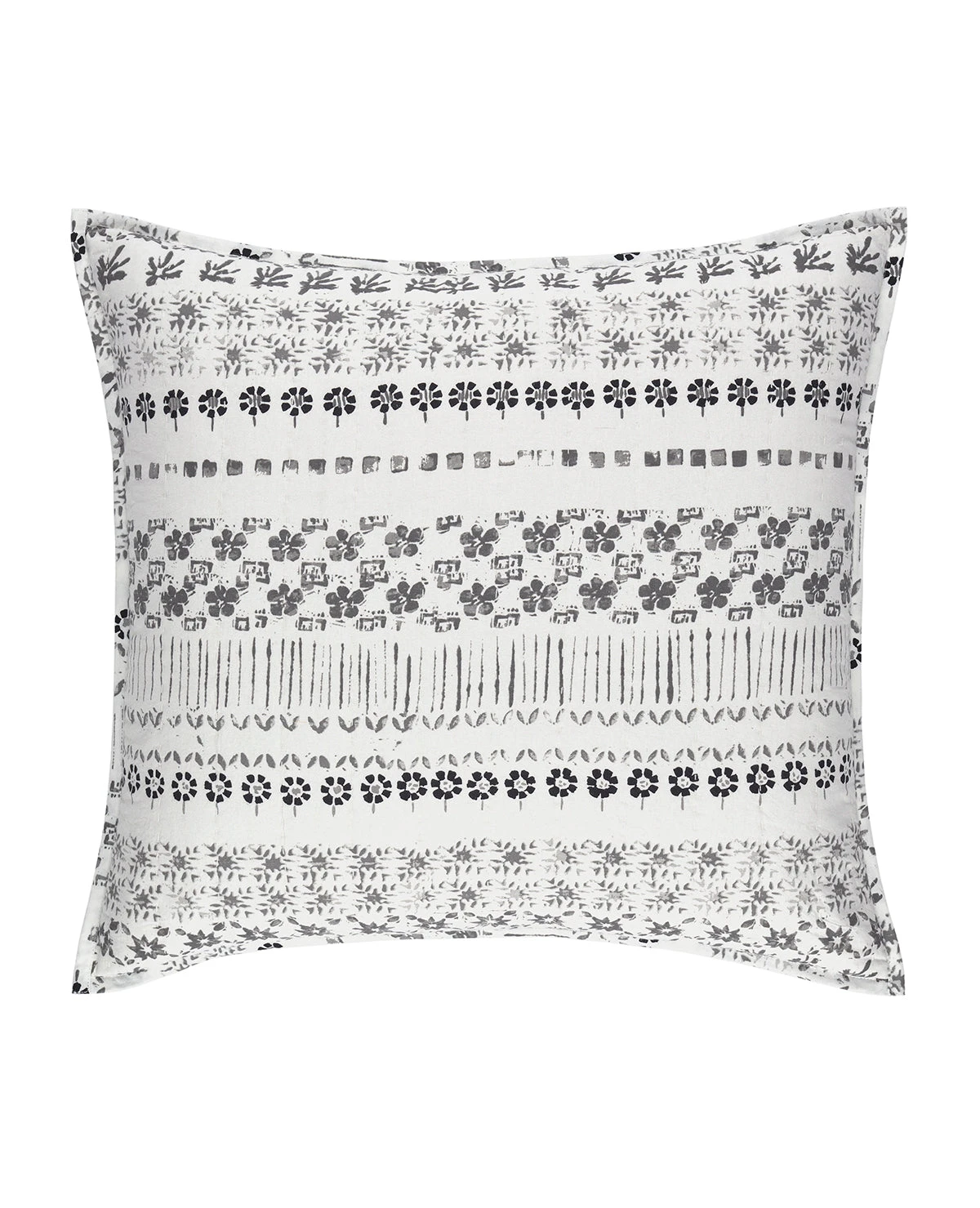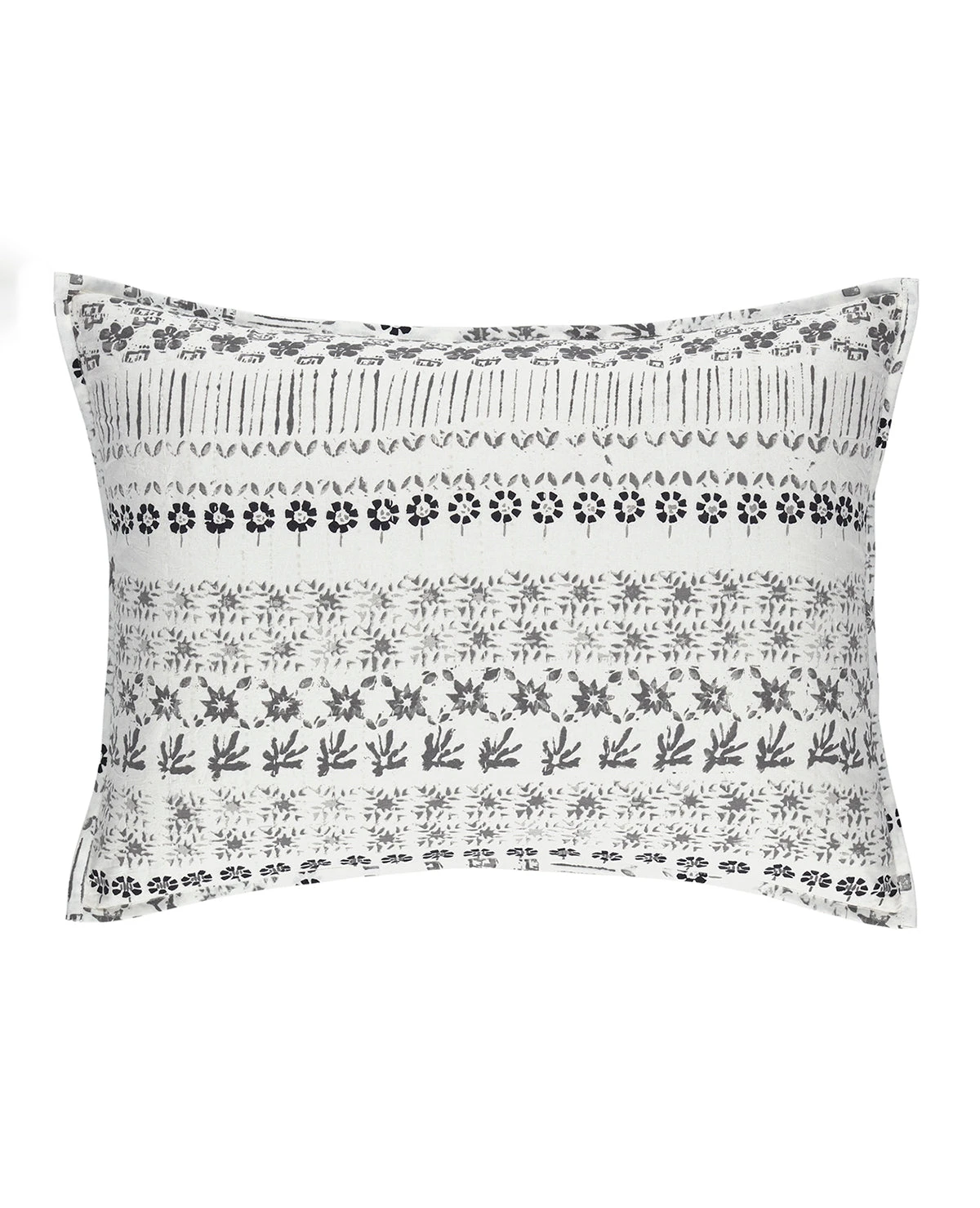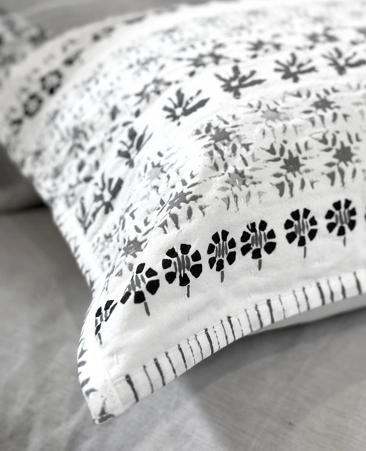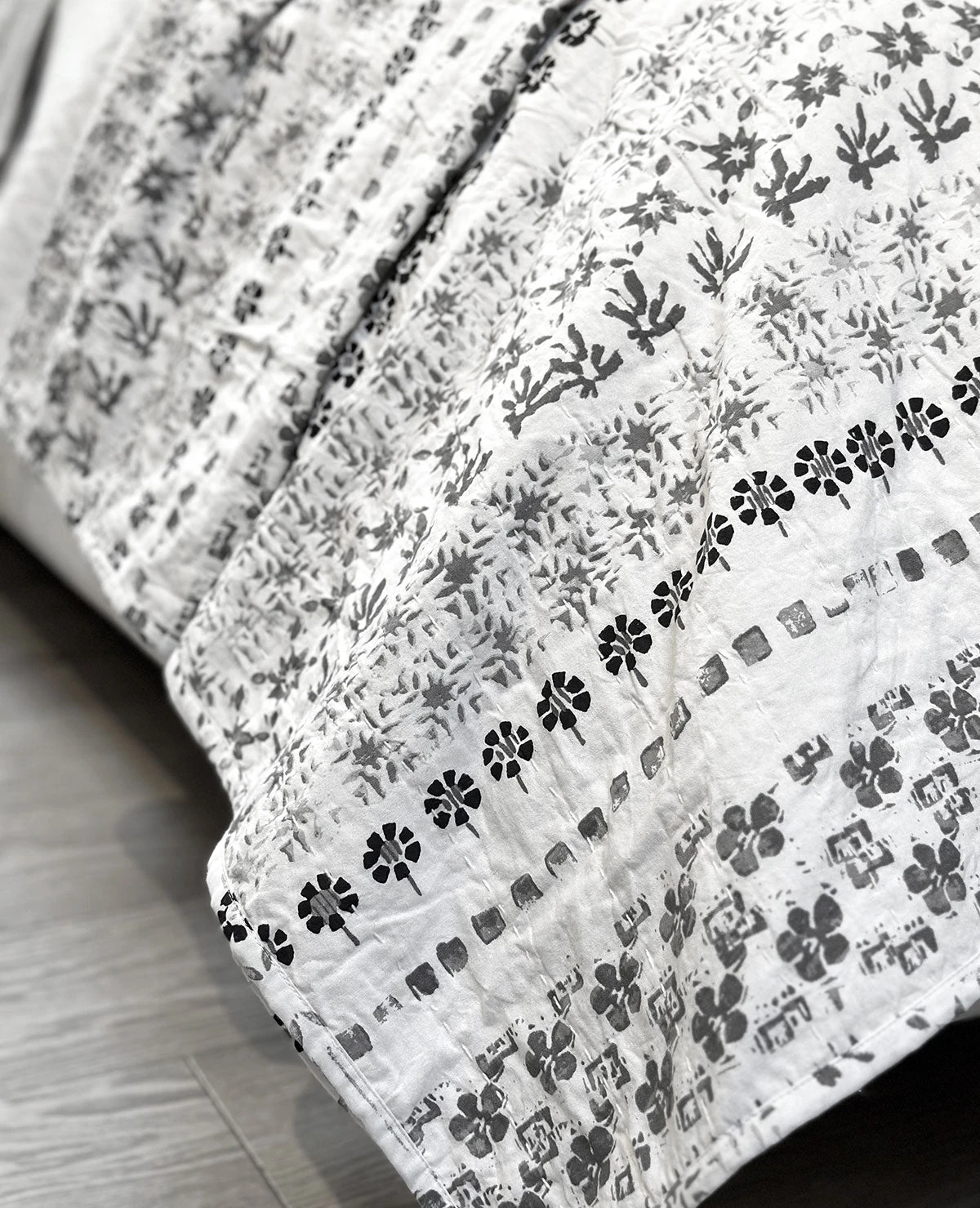 Inspired by traditional Indian block prints, this lightweight coverlet features a repeating pattern of small scale floral motifs. Available in Grey and Neutral/Blue, this quilt is constructed of a double layer of fabric with a light kantha stitch quilting. Reverses to a solid cotton backing.