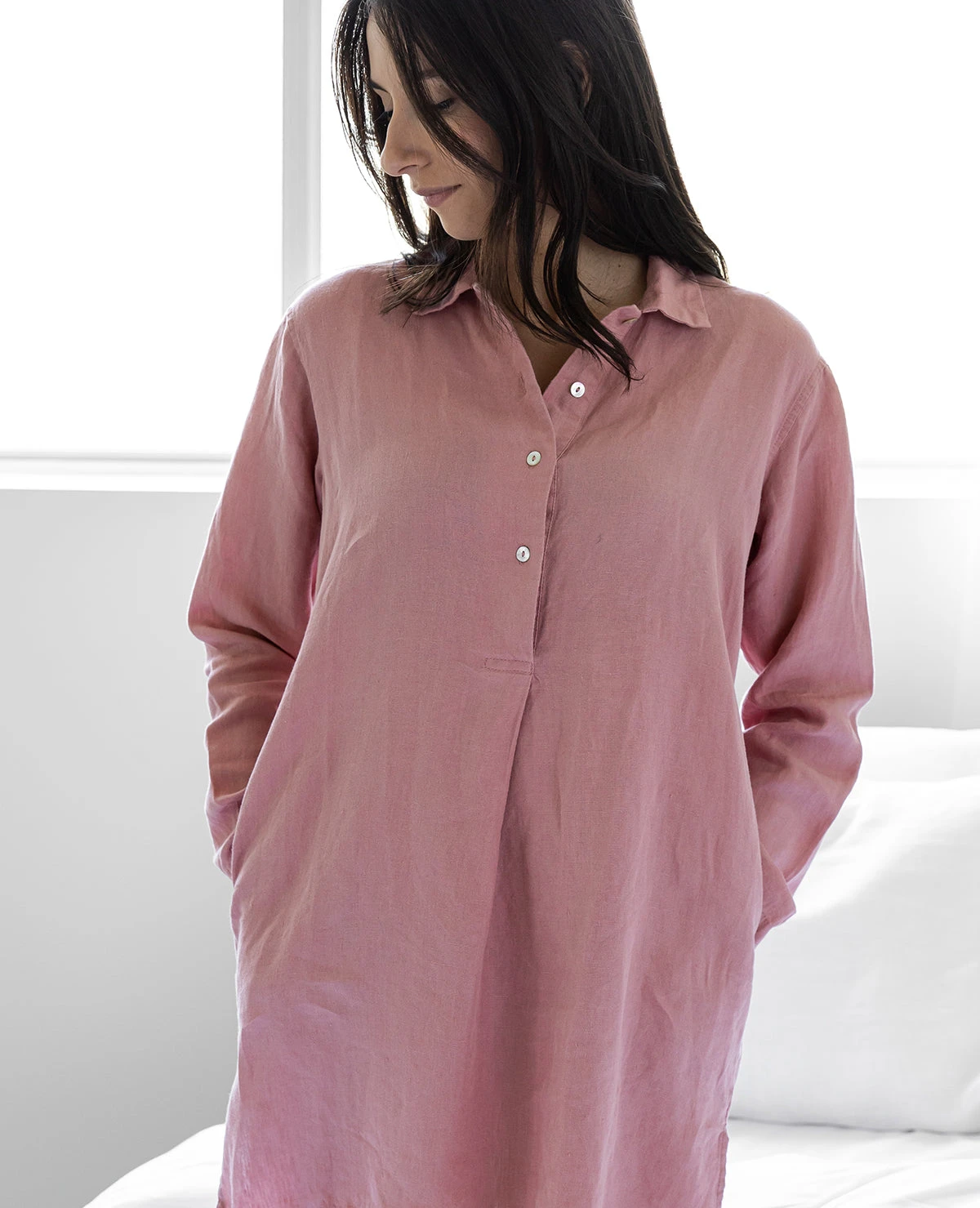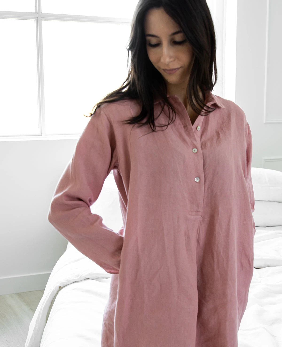 In our quest to find the perfect linen sleepwear, this stunning, pure 100% linen collection is spun from fibers of the flax plant and woven in Portugal. Cool to the touch and at once practical and luxurious, sleeping in this fabric will keep you cool all night. (Or, throw on some leggings and wear it out!)