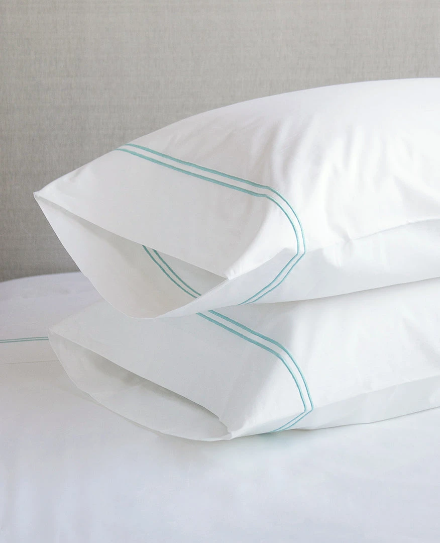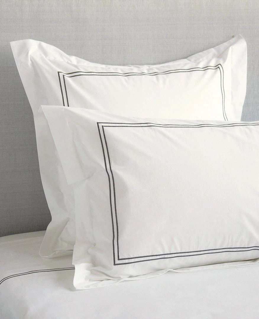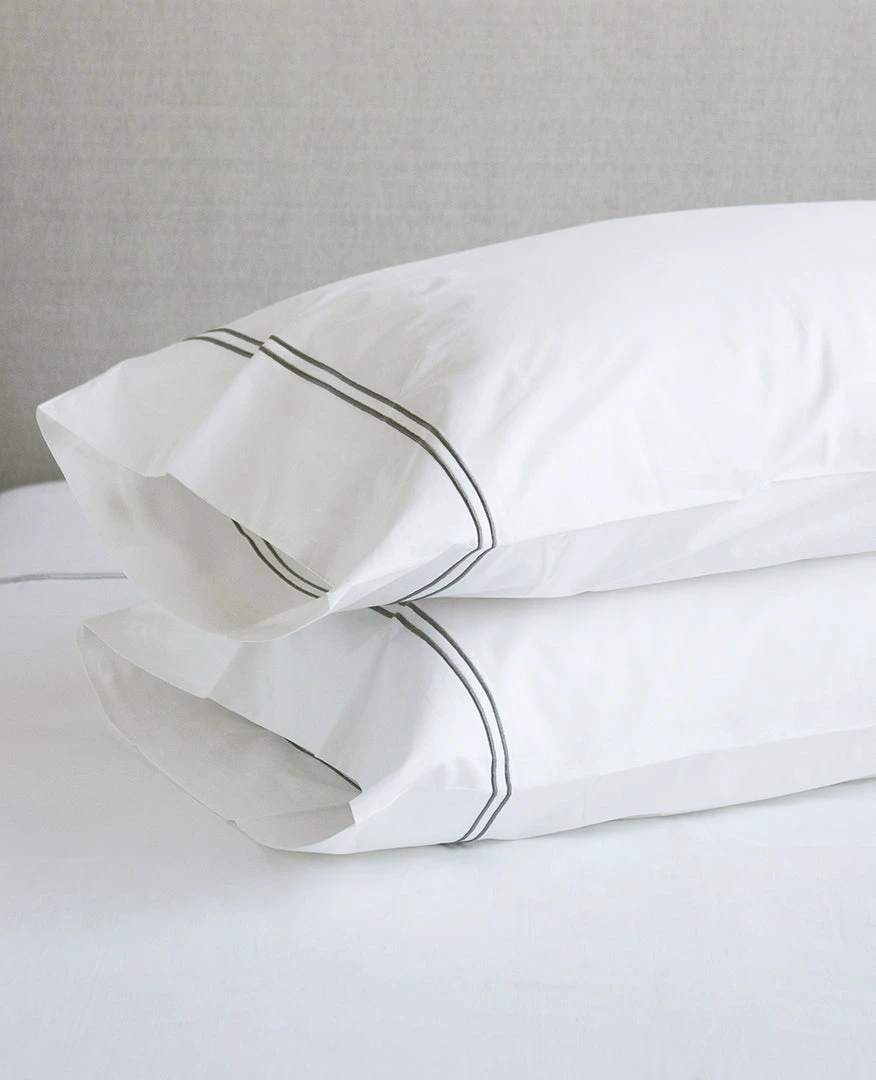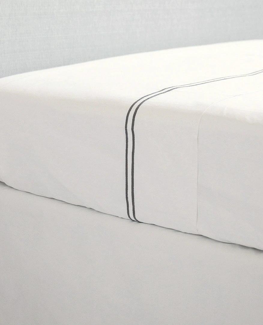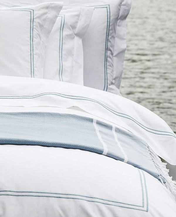 Our custom embroidered collections are proudly made-to-order at our Montreal workroom in the fabric and stitch colour of your choosing. Our Hotel 2-Line collection has been a top seller for decades. This classic, clean embroidery never goes out of style, and is made-to-order at our Montreal workroom. Select from over 20 thread colours to be embroidered on our crisp & cool 220 Thread Count Percale.