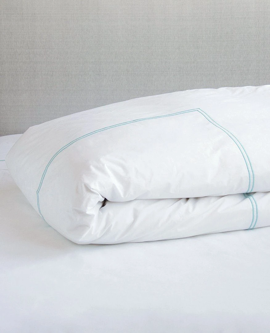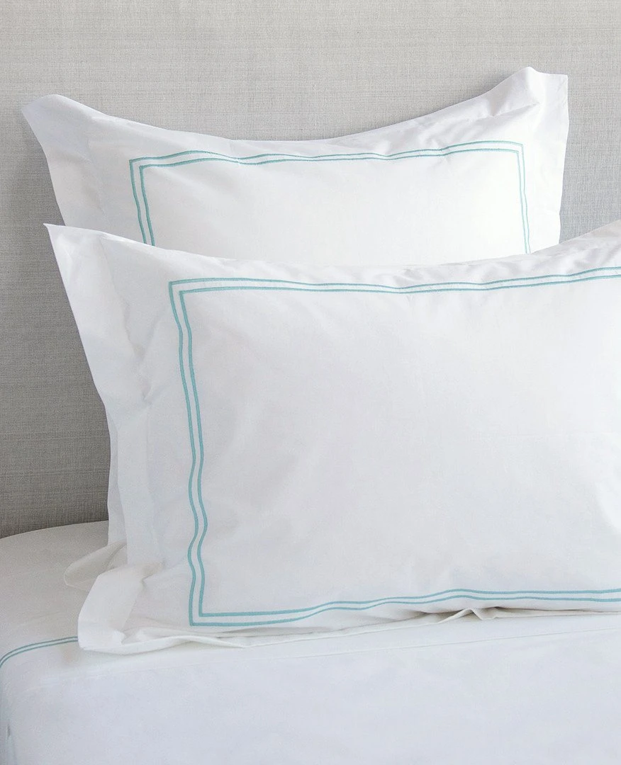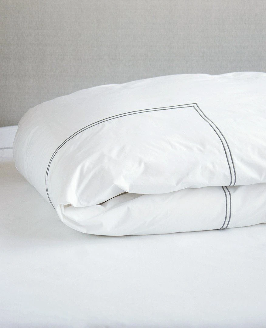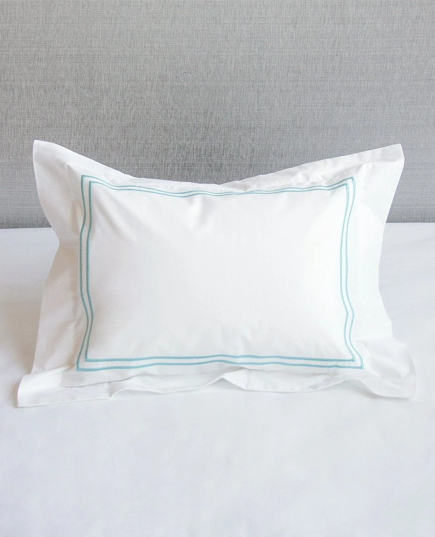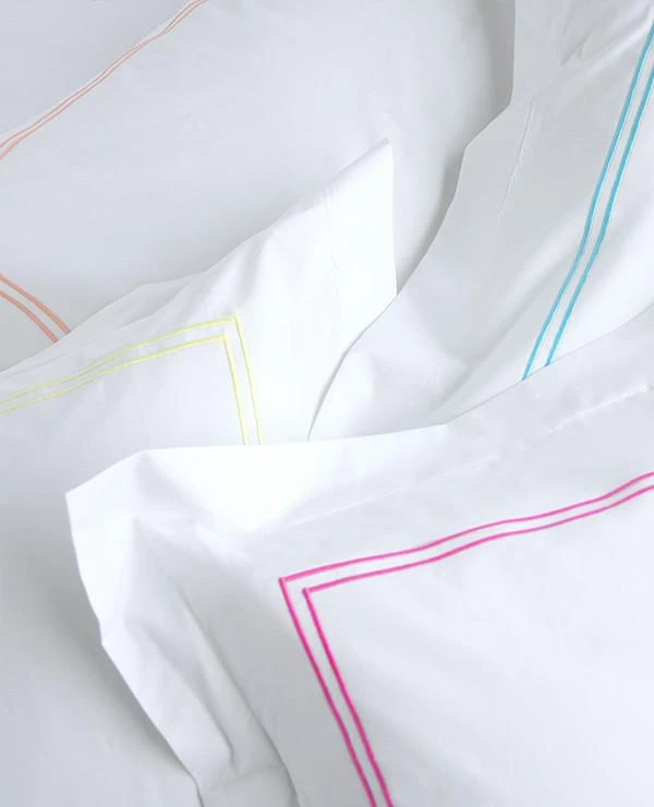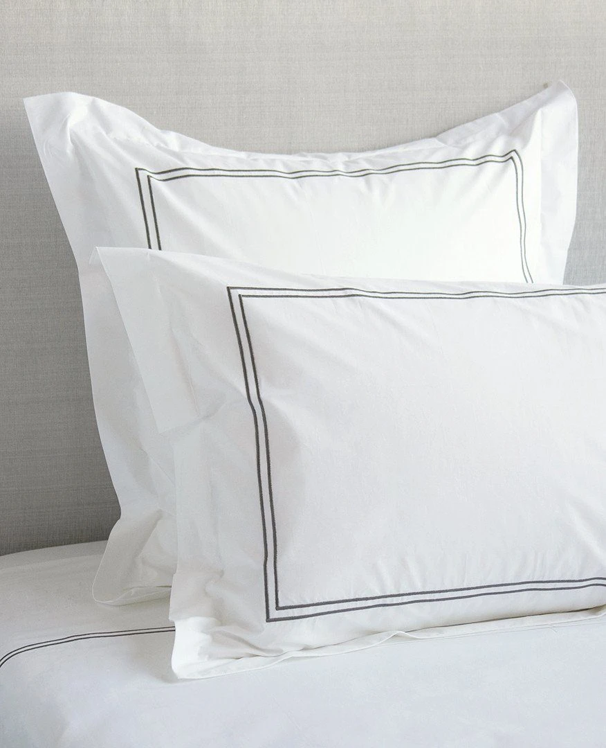 Our custom embroidered collections are proudly made-to-order at our Montreal workroom in the fabric and stitch colour of your choosing. Our Hotel 2-Line collection has been a top seller for decades. This classic, clean embroidery never goes out of style, and is made-to-order at our Montreal workroom. Select from over 20 thread colours to be embroidered on our crisp & cool 220 Thread Count Percale.