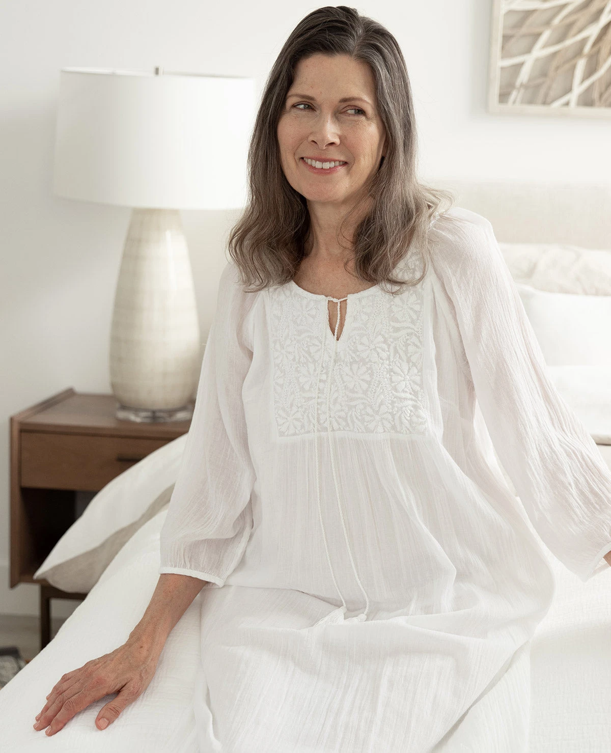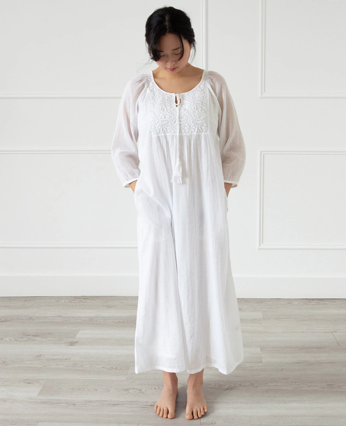 This romantically styled nightgown is woven of breathable 100% cotton, making it perfect for warm nights. The bib yoke features a delicate hand-embroidered floral motif finished with tassel ties at the neckline. This nightgown is lined for comfort and the 3/4 length sleeves feature a gentle elastic band at the cuff. Side-seam pockets are the finishing touch, lending themselves to a nightgown that is at once beautiful and functional.