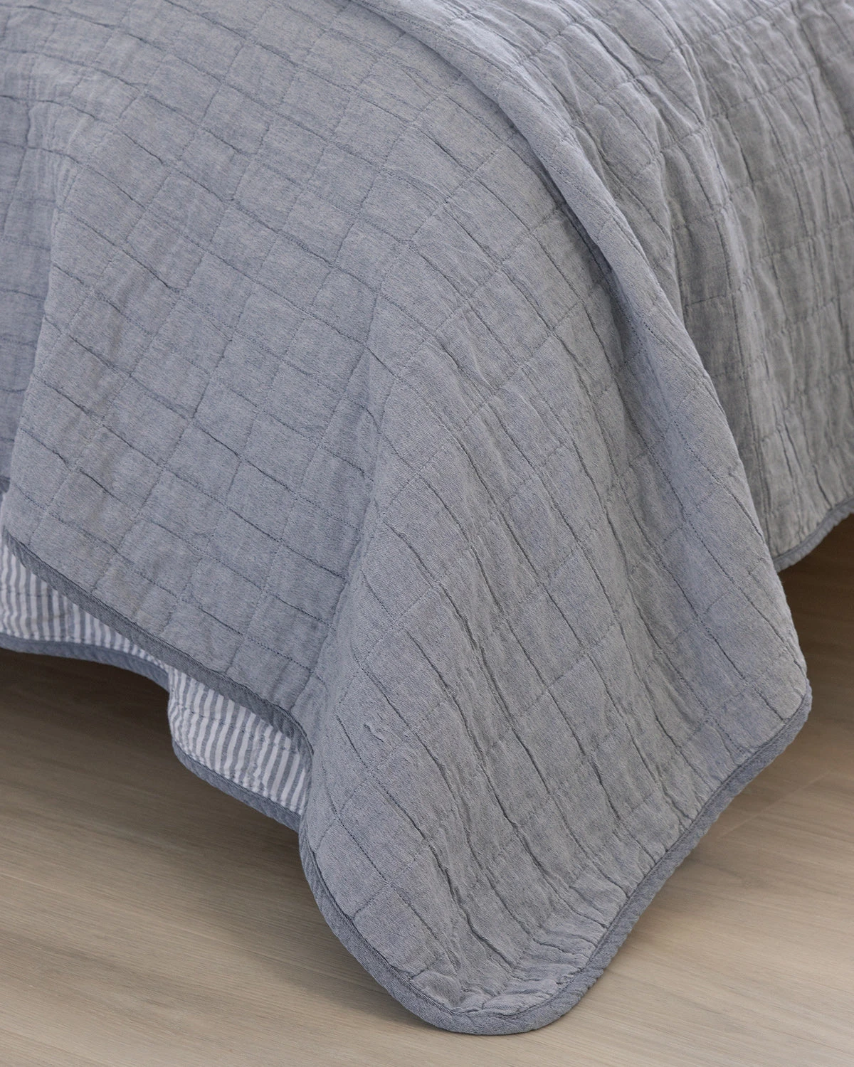 This classic preppie quilt has a clean, simple quilted pattern of small squares made of 100% cotton yarn dye fabric, with one side solid Chambray navy reversing to a classic Oxford stripe navy. Perfect for the cottage, the kids and the master bedroom year-round.