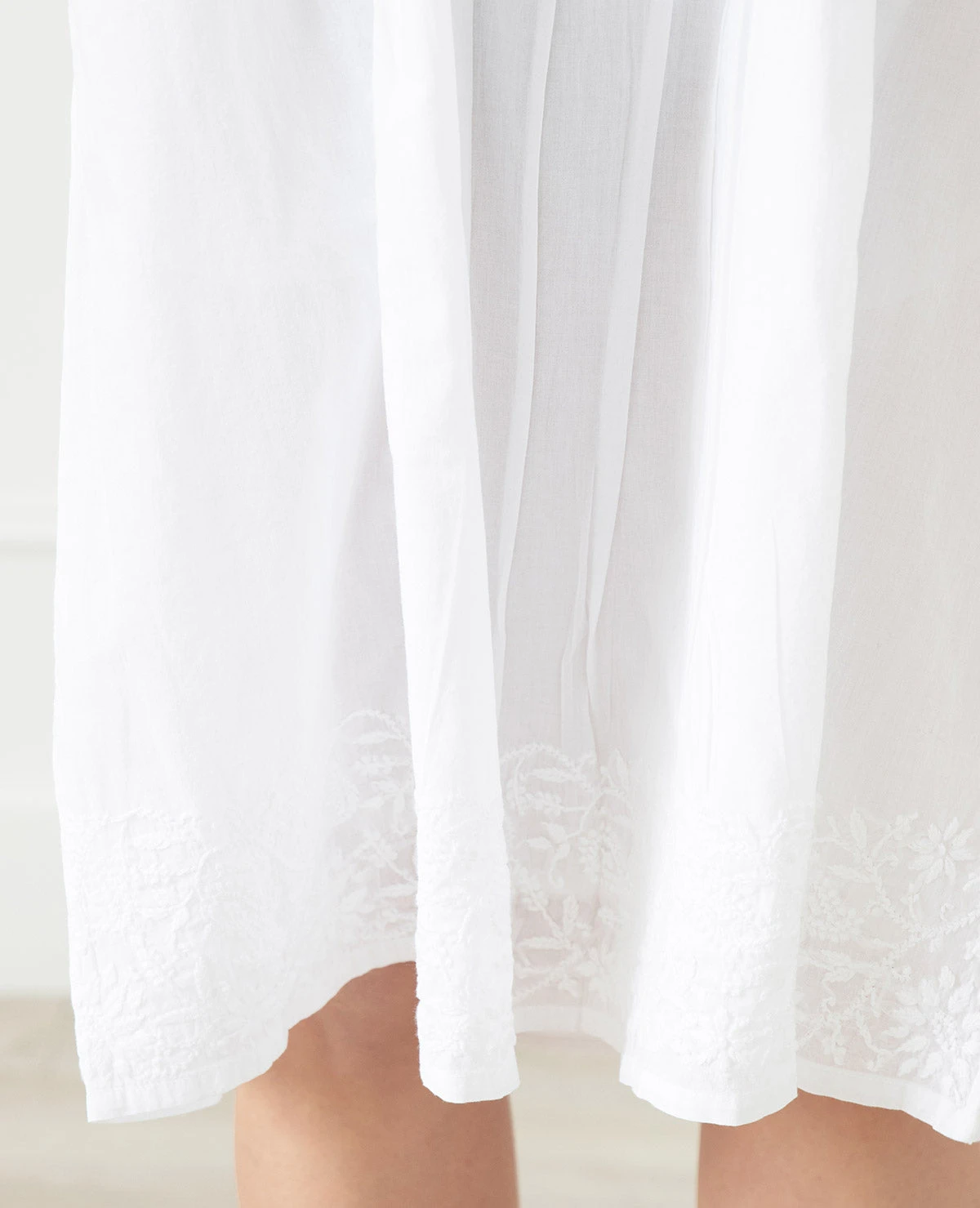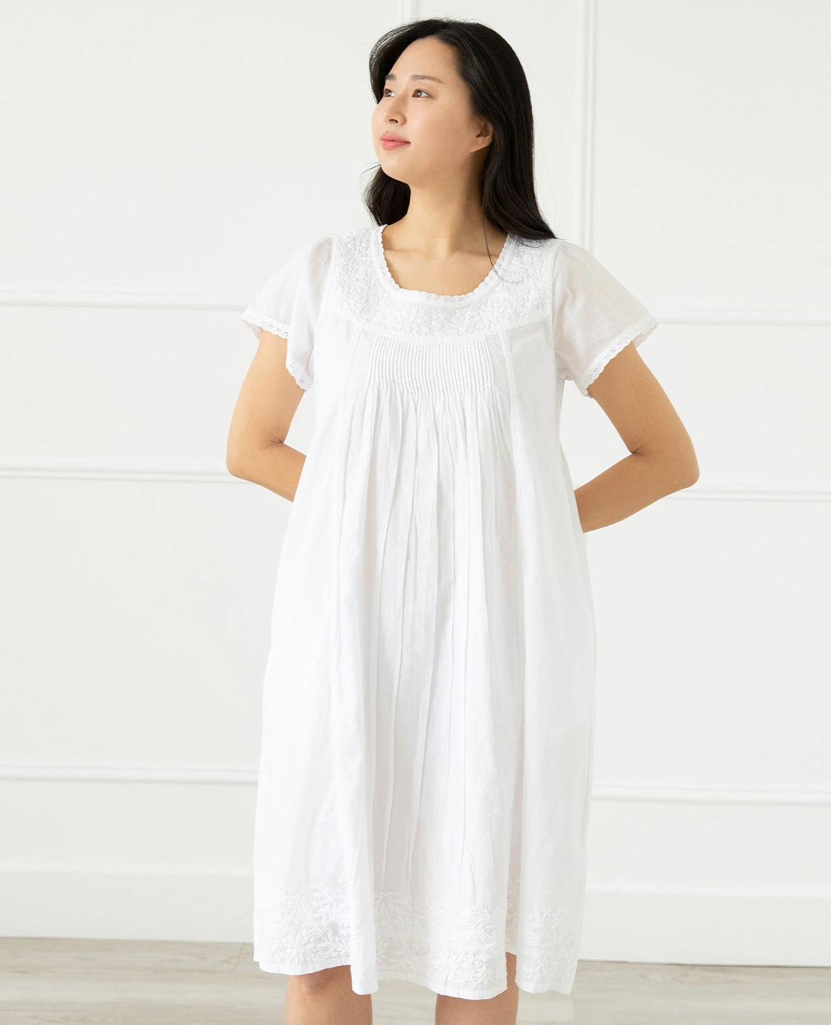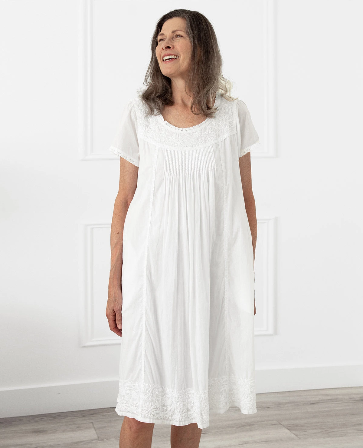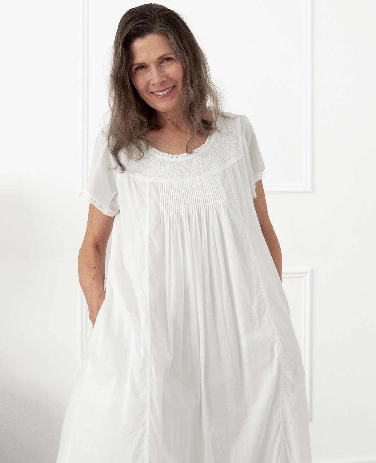 This simple cap-sleeve nightgown is woven of 100% cotton, making it the perfect ensemble for warm summer nights. Featuring a delicate embroidery at the rounded neckline, light pin-tucking, and side-seam pockets, this nightgown is as charming as it is practical.