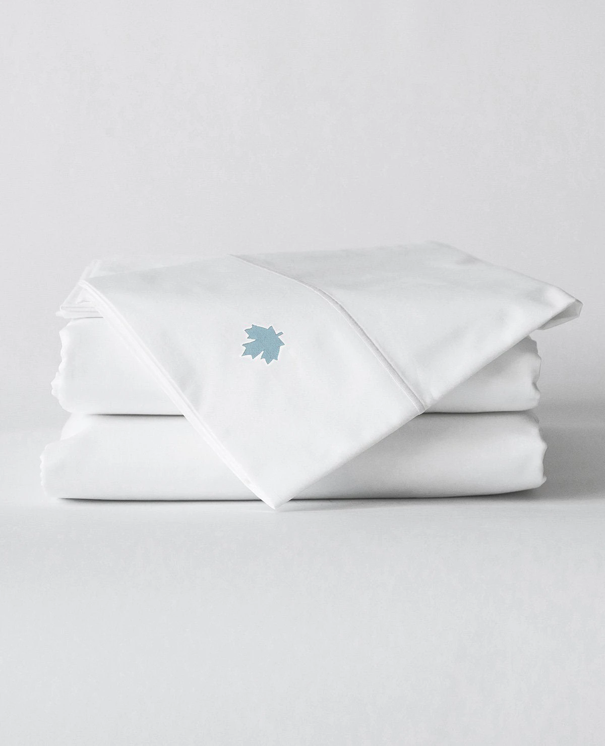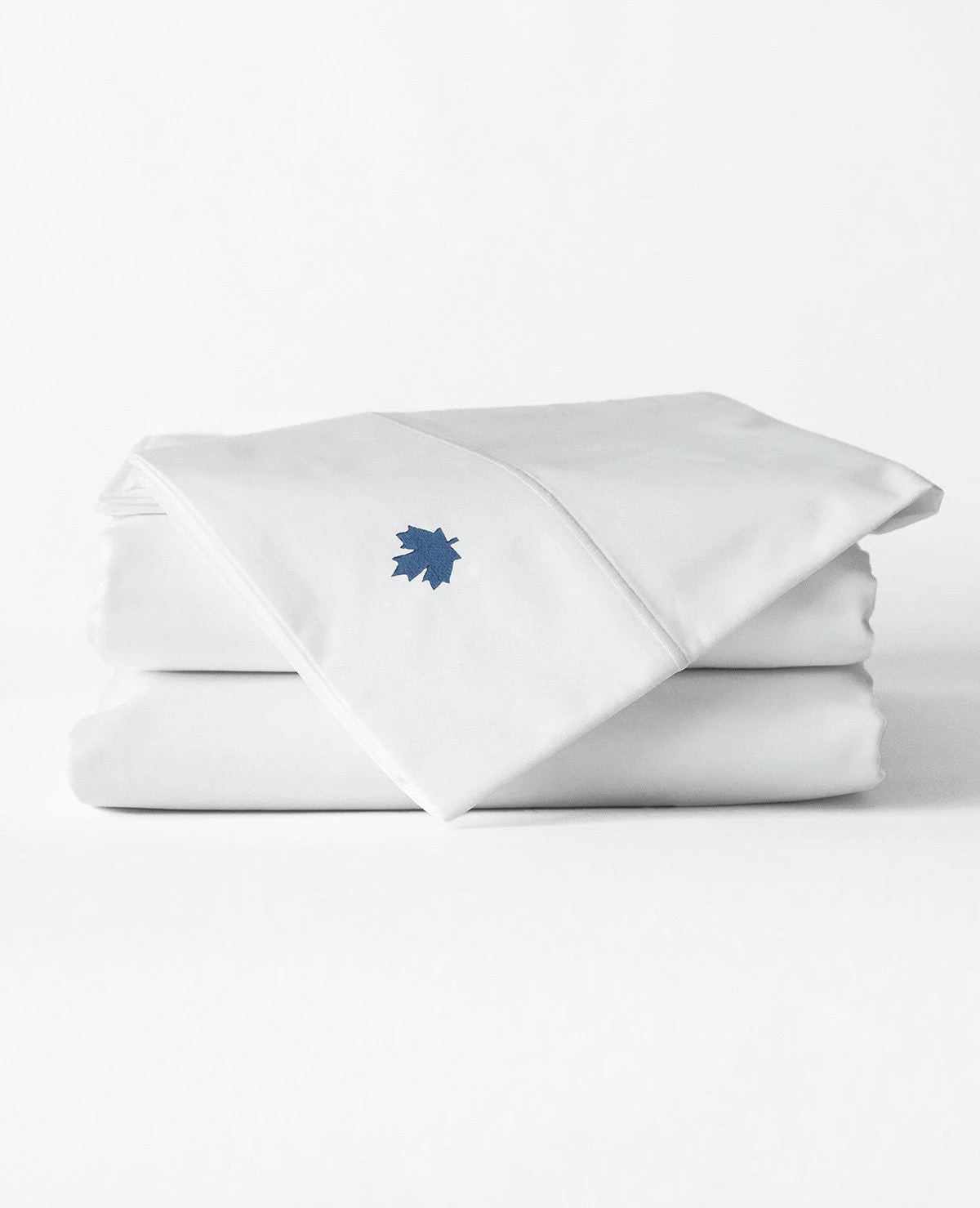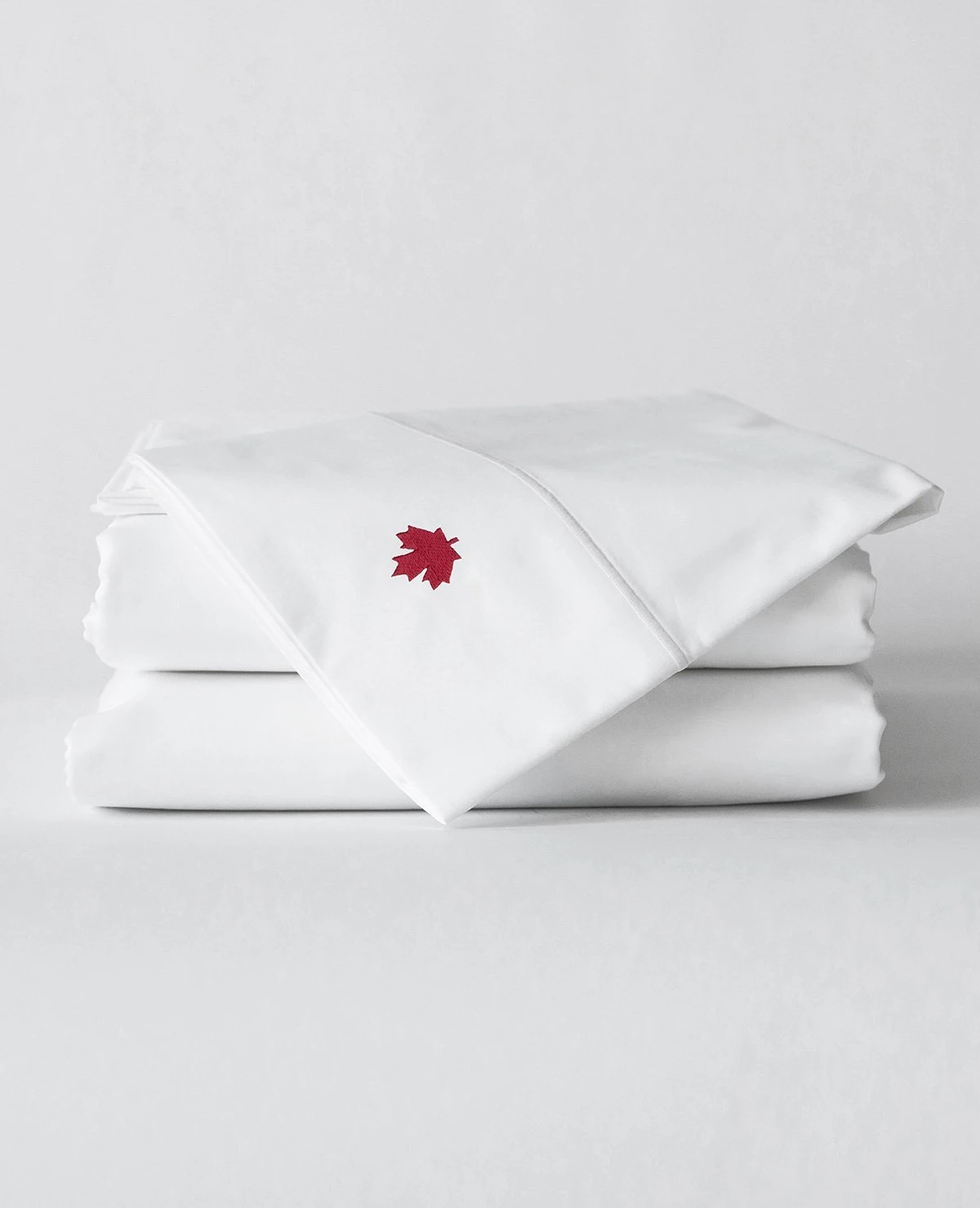Our Maple Leaf bundle is now available in our bestselling Essential 220 Thread Count Percale and includes a crisp white cotton flat sheet, fitted sheet and pair of monogrammed pillow cases, as well as a complimentary cotton storage bag. The pillow cases feature our iconic maple leaf, monogrammed in white, red, Au Lit blue, Maple Leaf Blue or silver on 220TC white cotton percale. The sheets are woven in Italy with the finest quality Egyptian cotton and made right here in Canada. This limited-edition offering is our lasting tribute to this beautiful country. We’ve never been more proud to be Canadian.