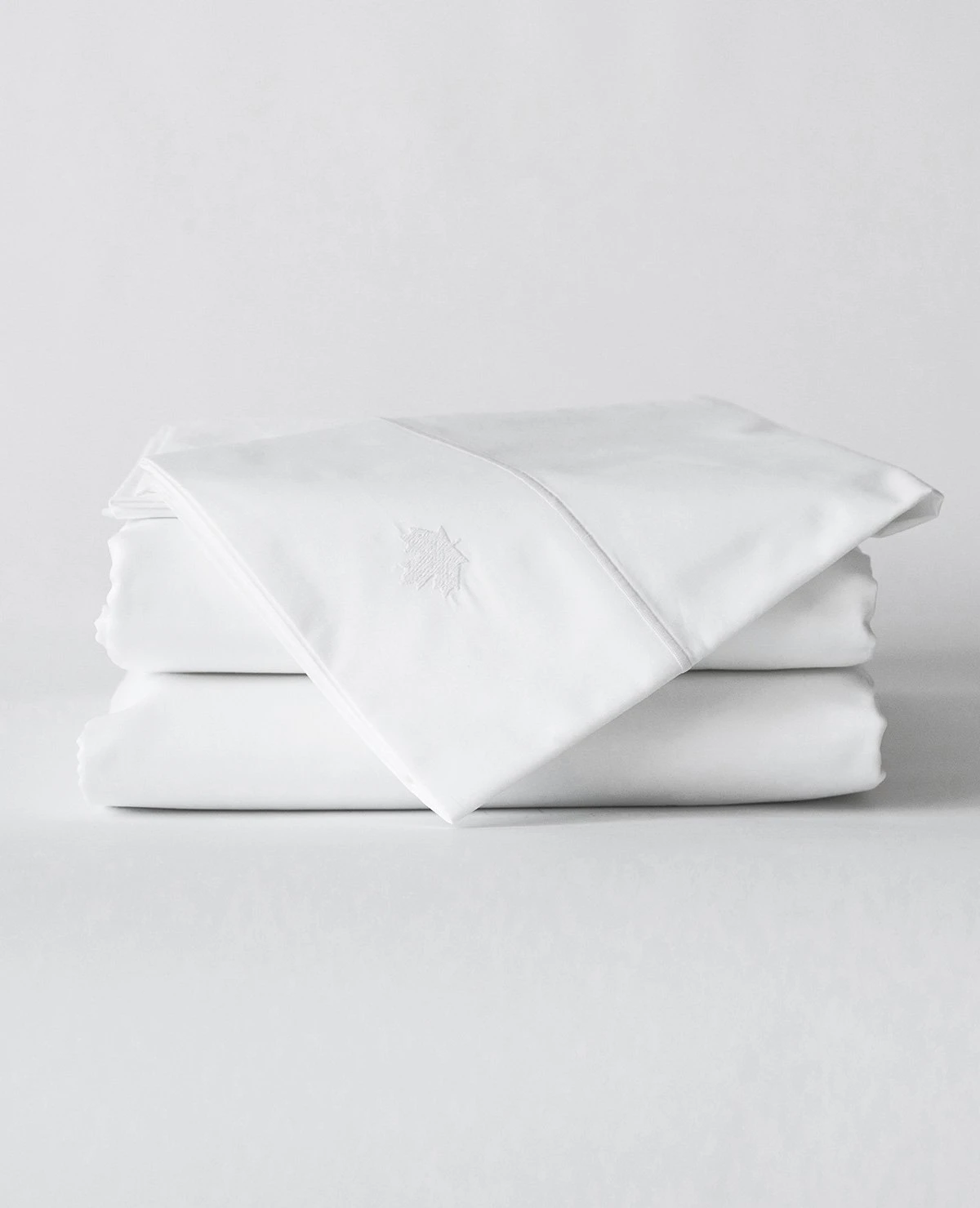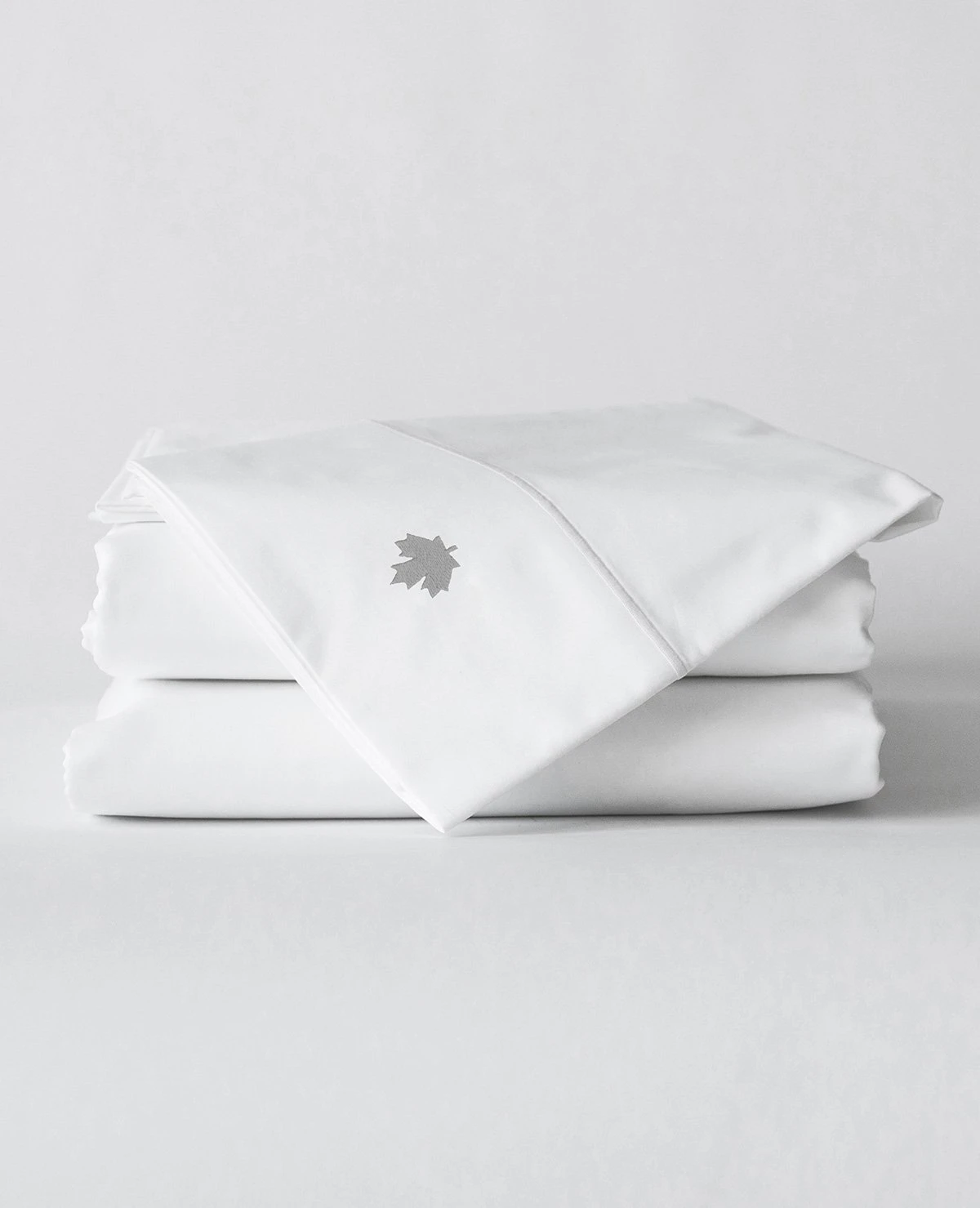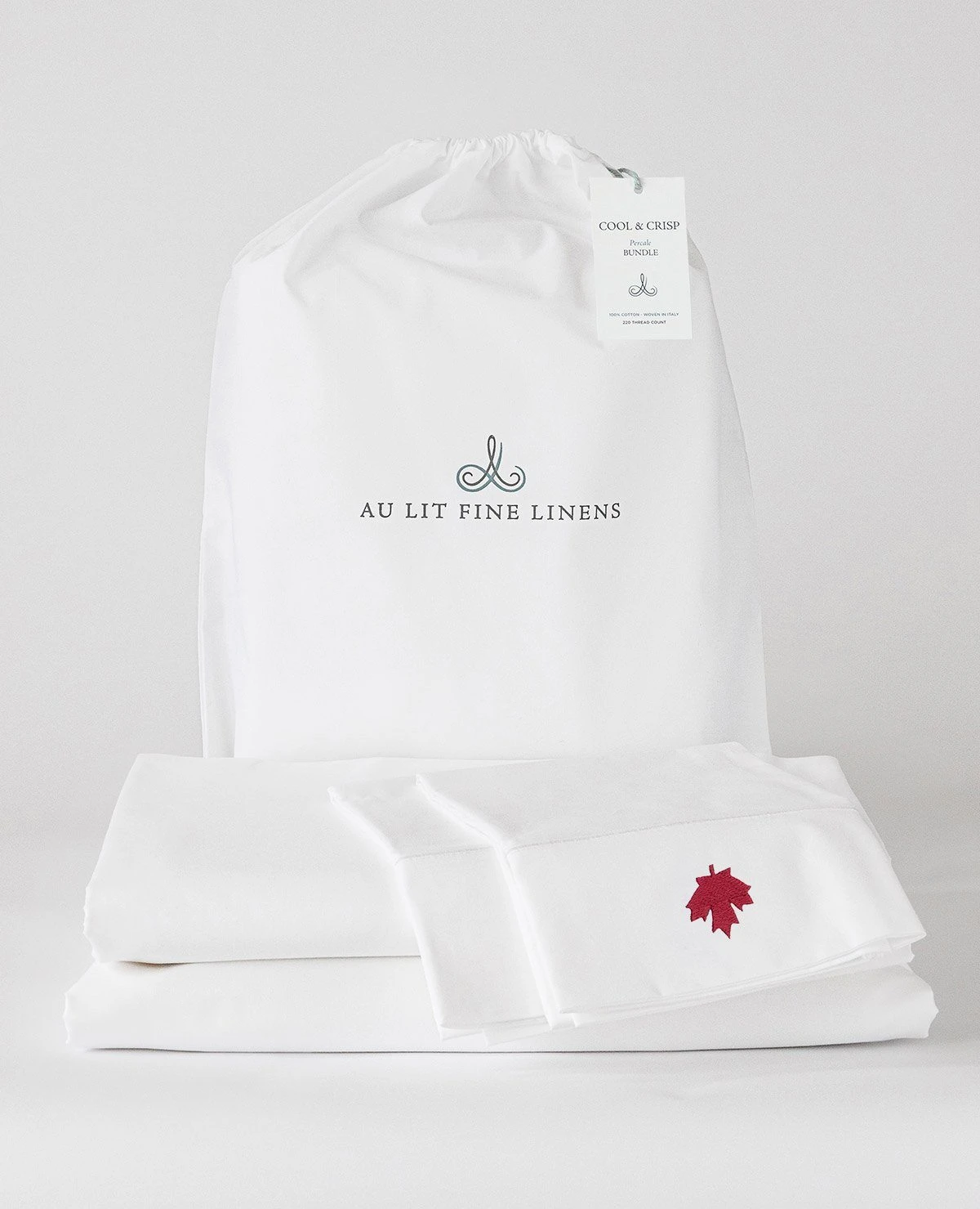 Our Maple Leaf bundle is now available in our bestselling Essential 220 Thread Count Percale and includes a crisp white cotton flat sheet, fitted sheet and pair of monogrammed pillow cases, as well as a complimentary cotton storage bag. The pillow cases feature our iconic maple leaf, monogrammed in white, red, Au Lit blue, Maple Leaf Blue or silver on 220TC white cotton percale. The sheets are woven in Italy with the finest quality Egyptian cotton and made right here in Canada. This limited-edition offering is our lasting tribute to this beautiful country. We’ve never been more proud to be Canadian.