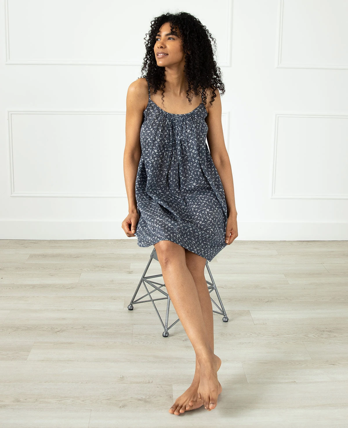 This short cotton nightgown is designed in Paris and handwoven in India. Featuring a delicate floral print and spaghetti straps, this loose-fitting nightie is made for fresh summer nights with the windows open.