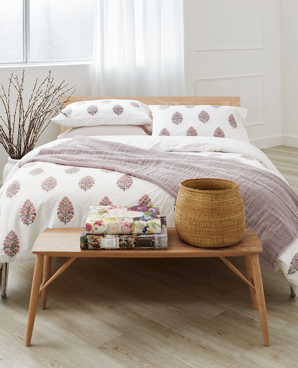 Bold & eclectic, this gorgeous design is printed on crisp, white cotton and reverses to a smaller print in a softer pastel hue. These deco pillows are traditionally and authentically hand-blocked in India. The Meera collection is fresh and clean and all pieces are completely reversible. Made in India with 100% cotton in a 200 thread count percale.