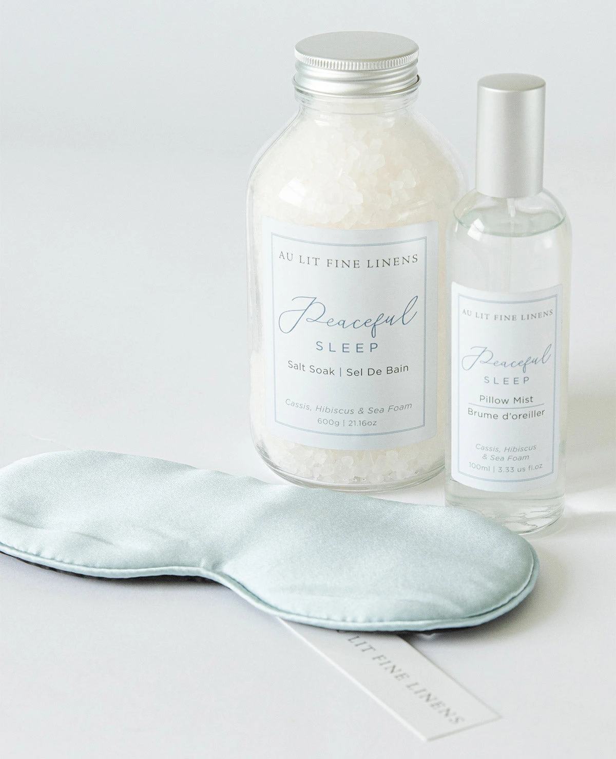 This refreshing Peaceful Sleep set includes a fragrant Pillow Mist, Salt Soak and Au Lit Blue silk eye mask. The bath salts and pillow spray are scented of calming notes of cassis, hibiscus and sea foam, our pillow spray has a white floral fragrance with fresh notes. Our spray and salt soak are made of 100% natural ingredients.