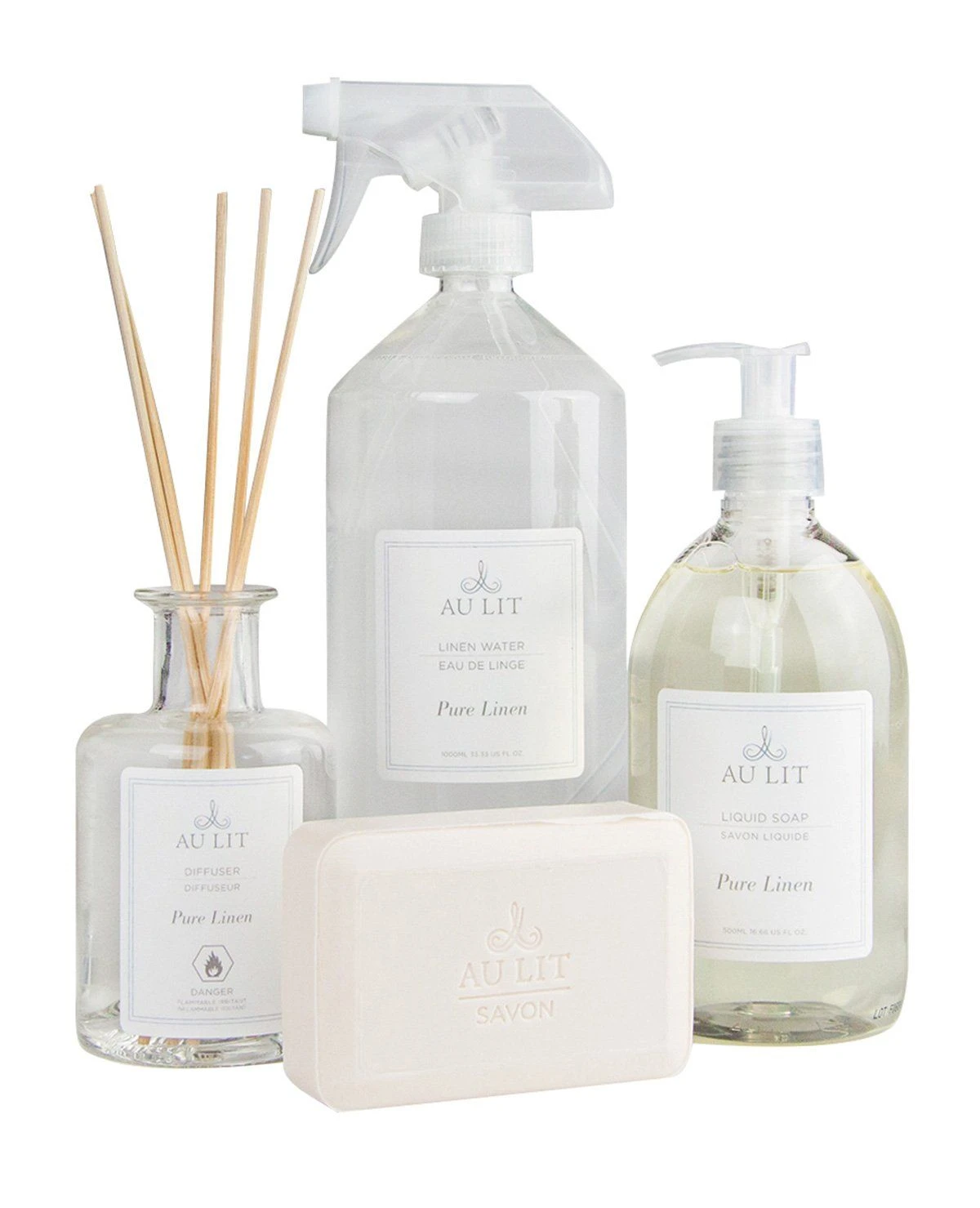 Introducing our brand new collection of Pure Linen scented bath products made exclusively for Au Lit in Haute-Provence, France. Gift set includes linen water, bar soap, liquid soap and diffuser.