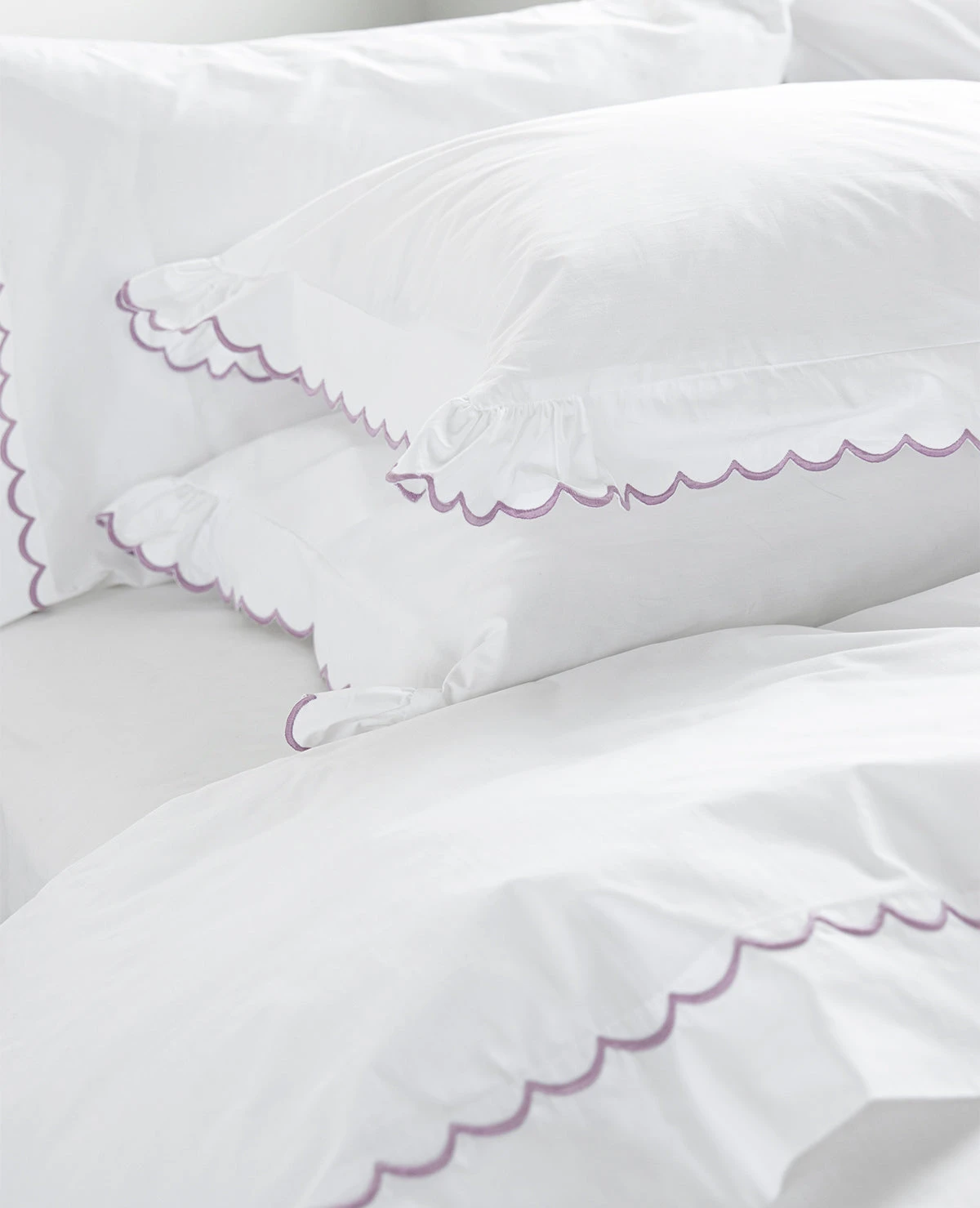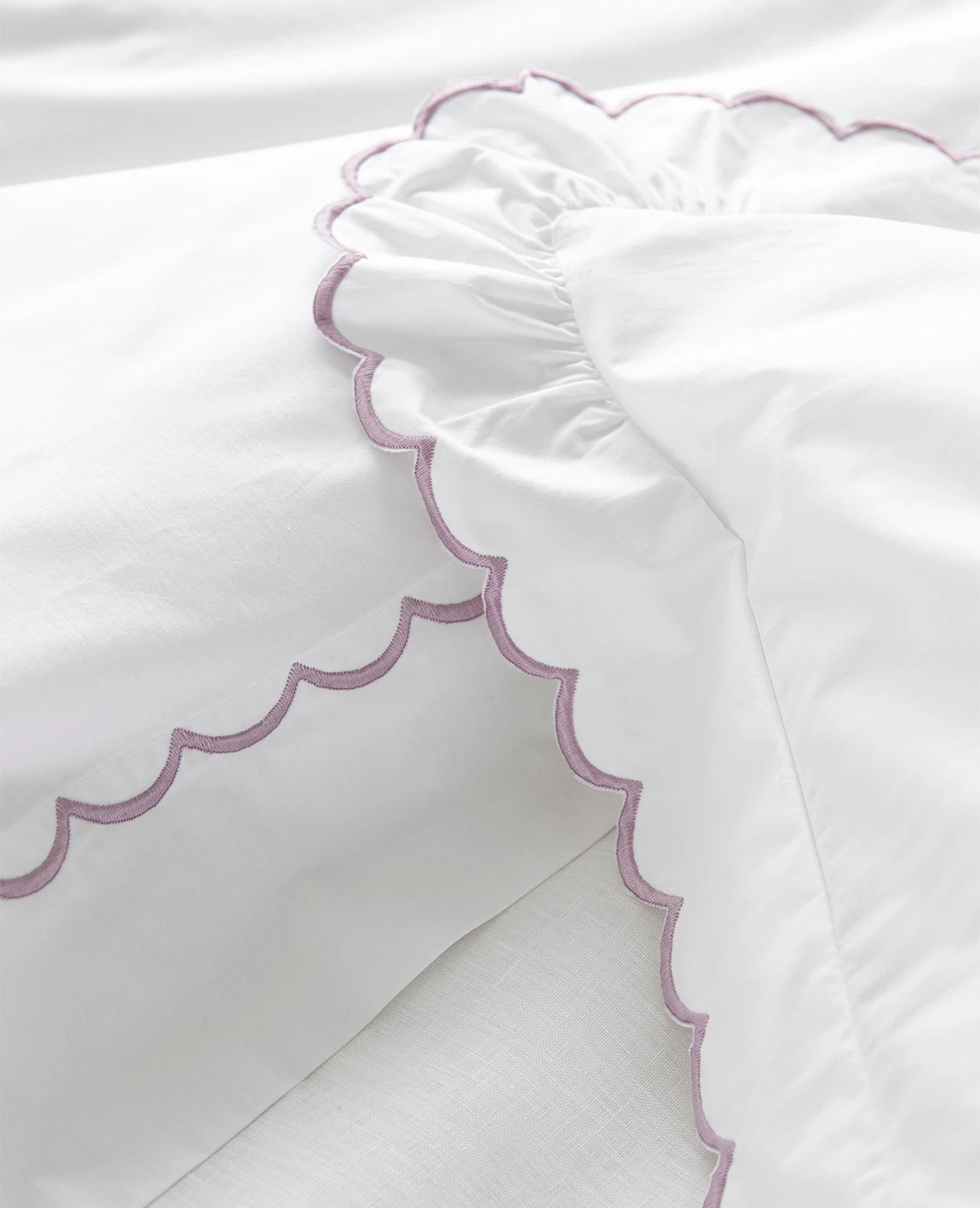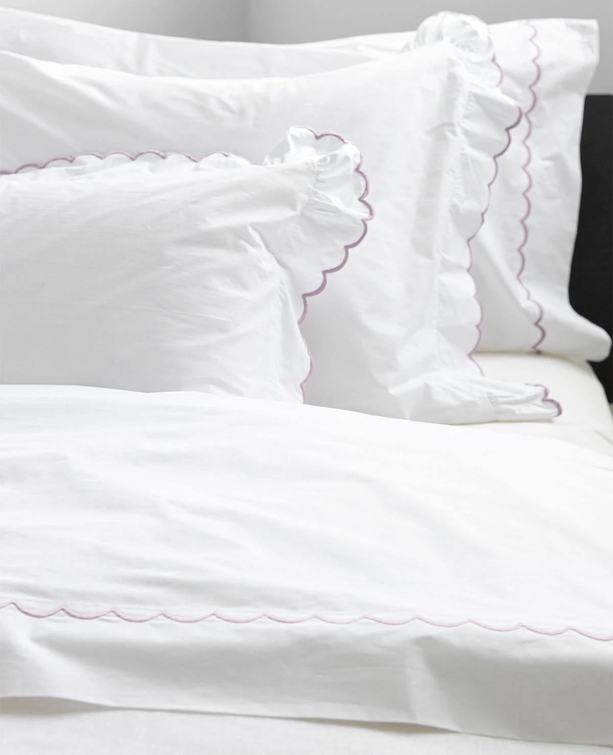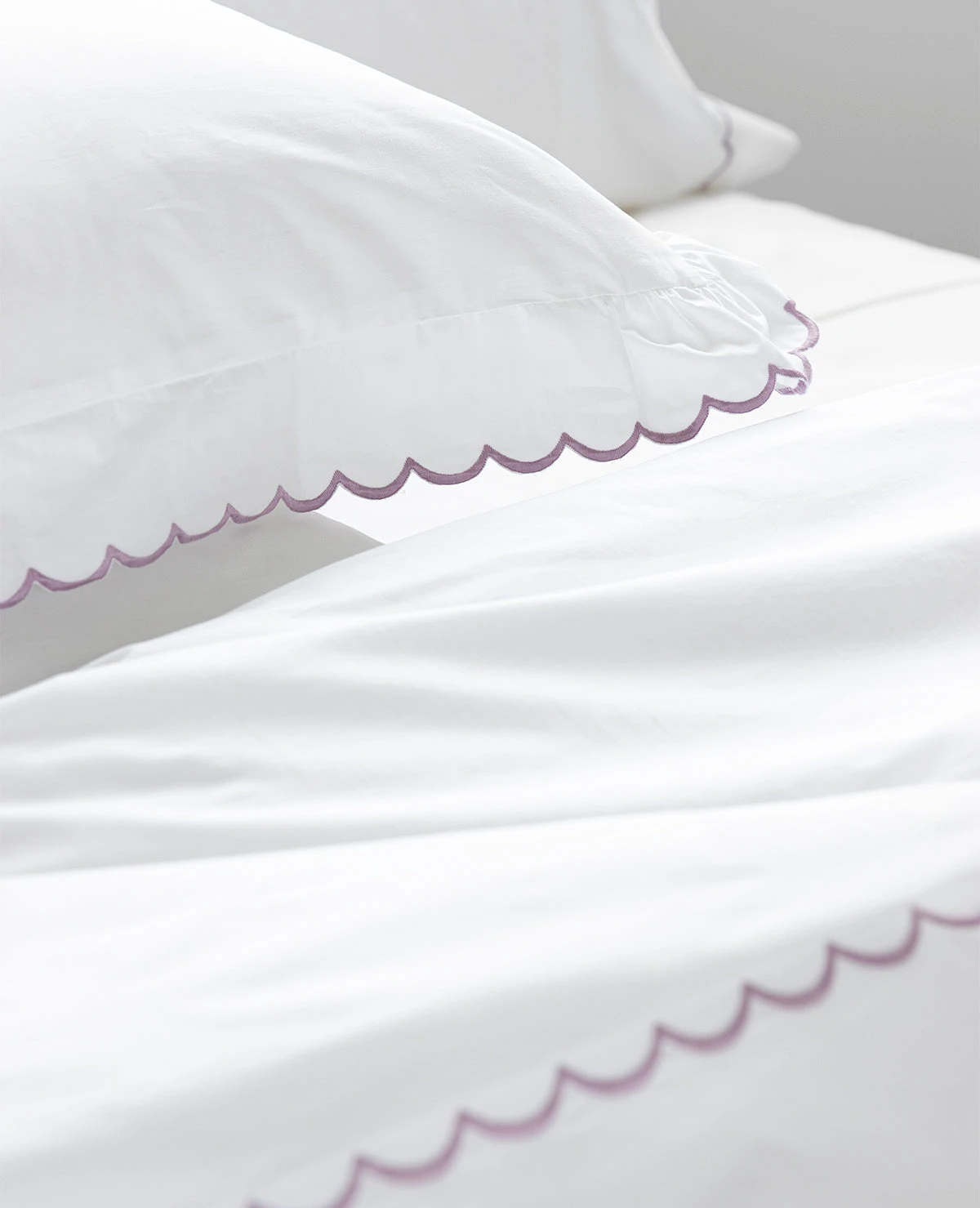 Our exquisite quality scalloped sheets have been part of the Au Lit collection since our earliest days, more than forty years ago. This pretty, feminine detail has stood the test of time and adds the perfect touch to a more feminine bed. Newly available for embroidery on our bestselling 410 Thread Count Percale, personalize your bedding by selecting from over 20 distinct stitch colours. You can now enjoy your favourite buttery soft long-staple cotton sheets with a personalized feminine touch.