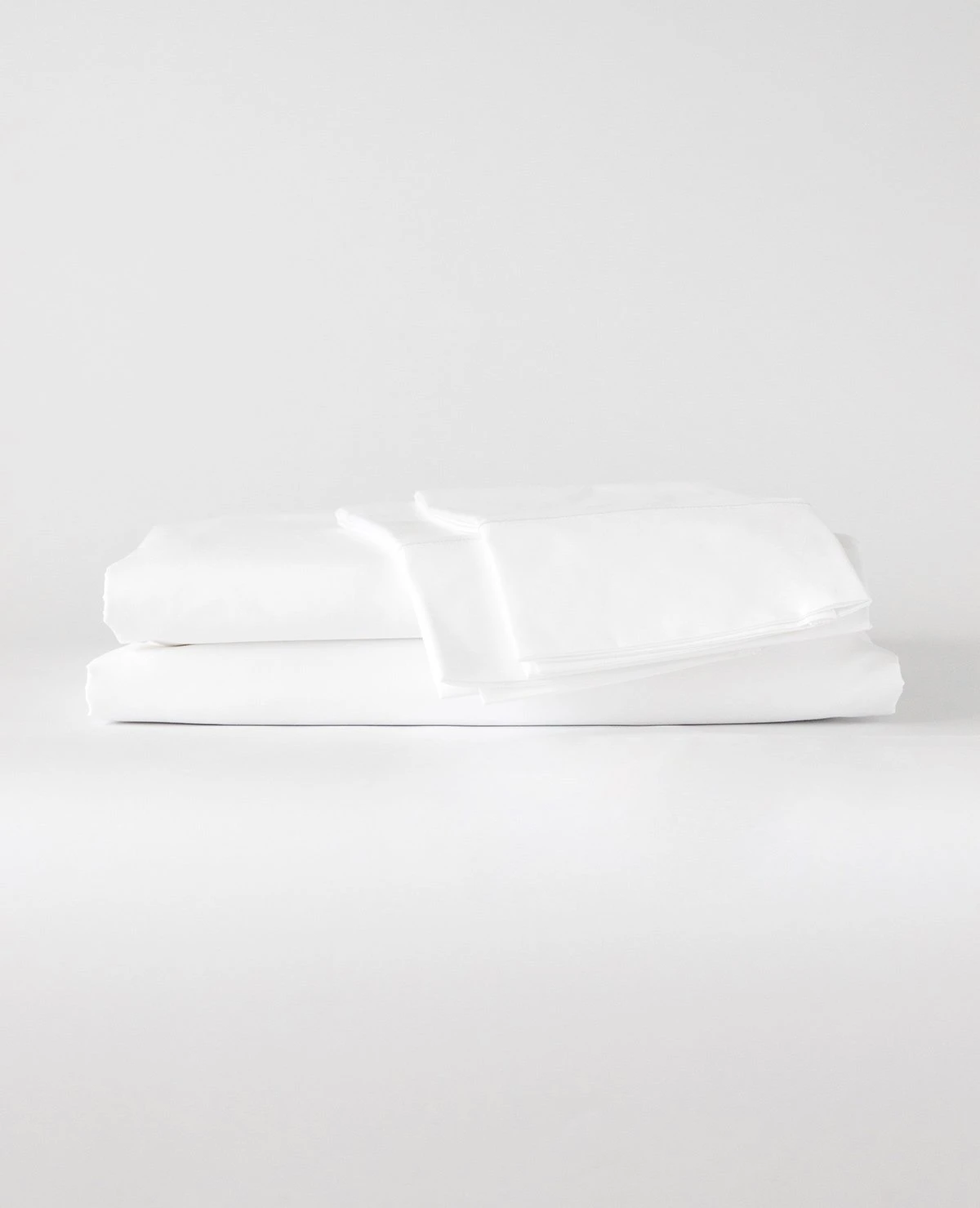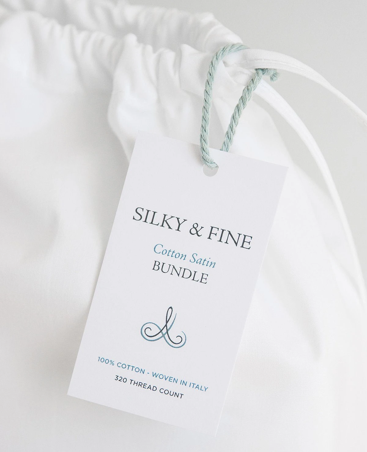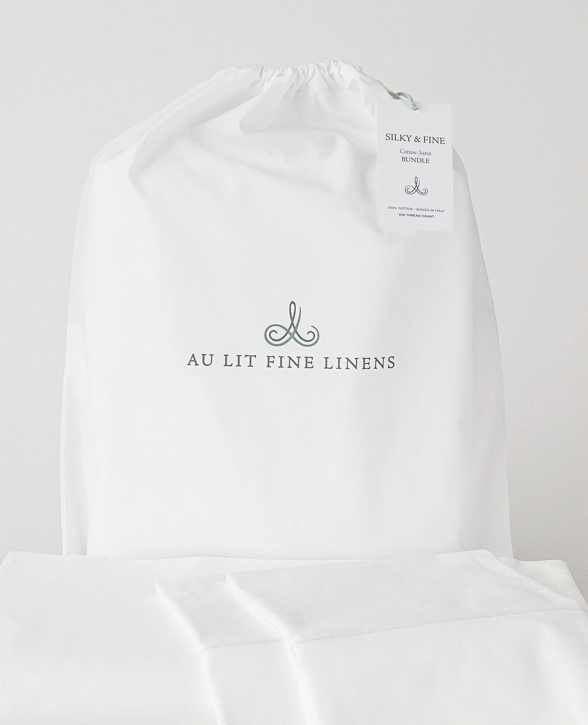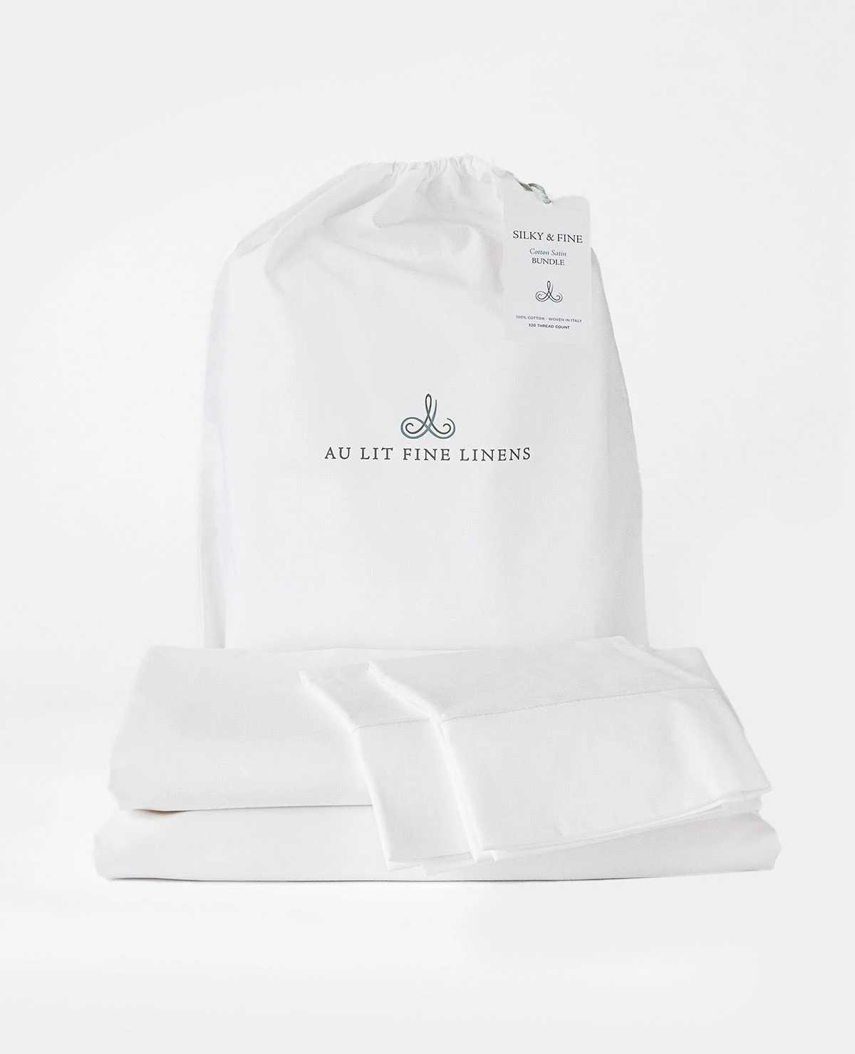 Our best-selling white 320 thread count cotton satin is just the ticket for those who love silky soft sheeting. Now that a flat sheet, fitted sheet, and pair of pillowcases are conveniently bundled in an exclusive 100% cotton storage bag, sinking into your very best sleep is easier than ever.