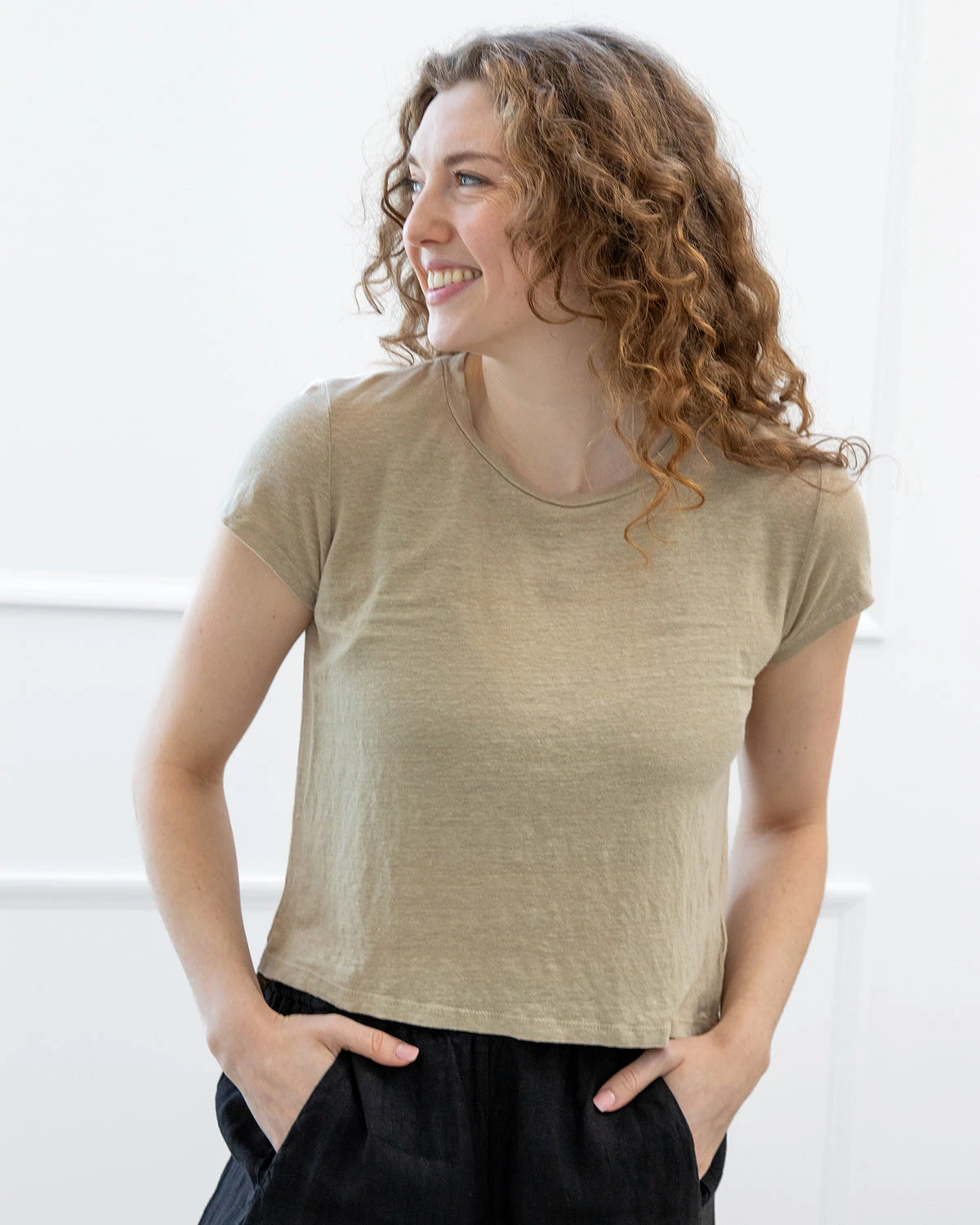The Casey tee is a linen knit, a softer take on traditional linen fabrics with a touch of stretch for ultimate comfort. This relaxed t-shirt is a new classic, featuring a crew-neck, boxy fit, and subtle hi-lo hemline. This tee has the look of cotton slub and the cool feel of linen.