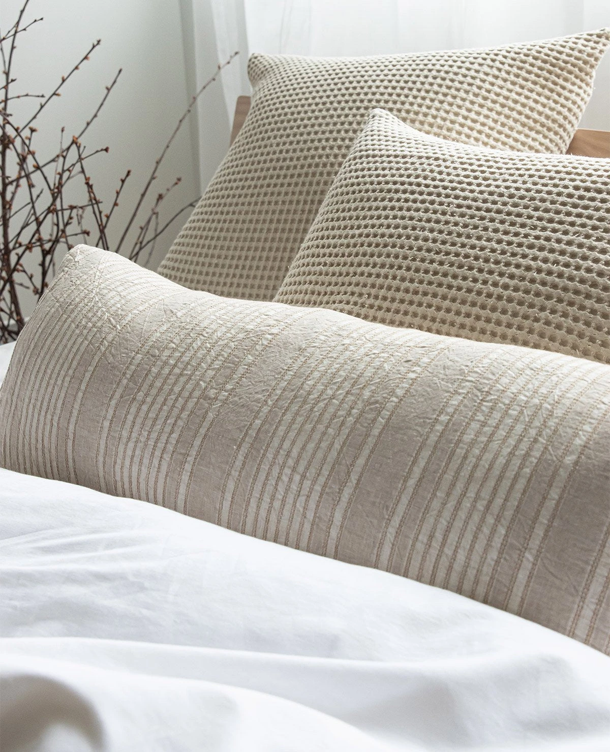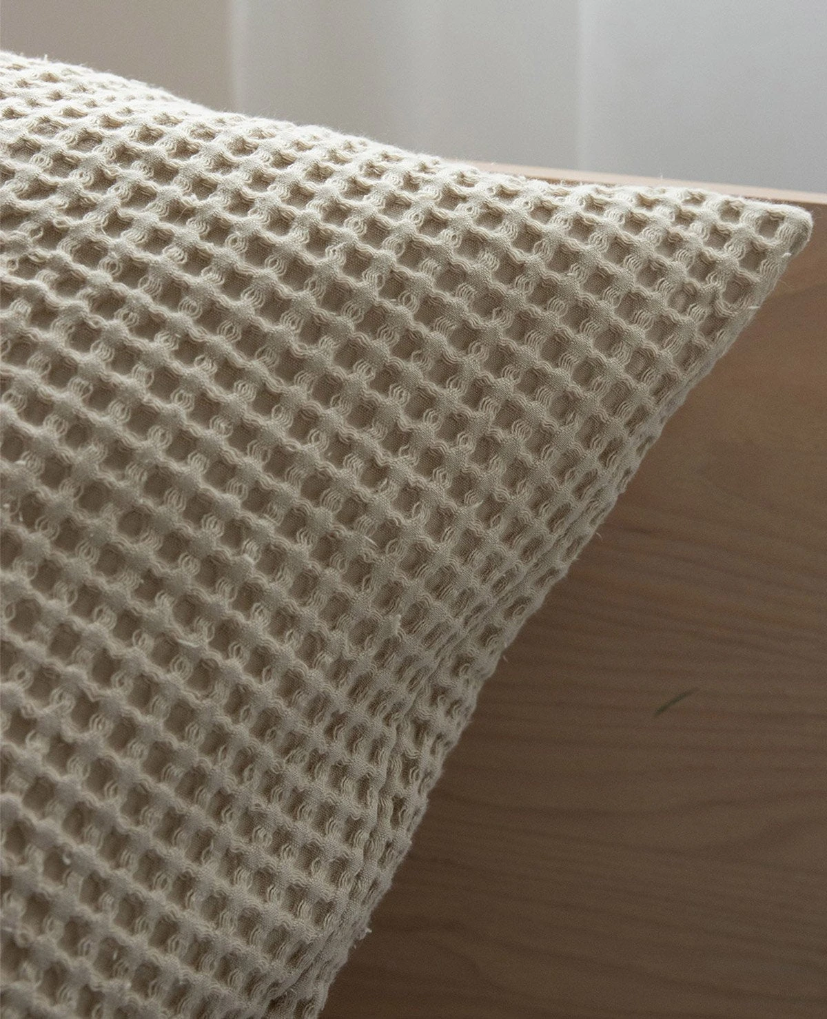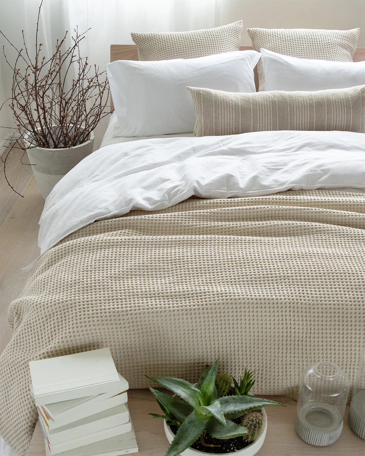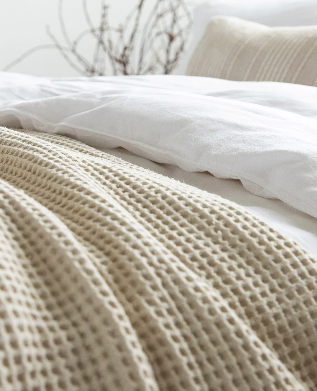Our iconic Lavato Waffle collection is a lightweight, pre-washed American long-staple Pima cotton texture woven in Italy. It’s the perfect weight to add on top of your duvet in the colder months, or to use on its own on warm summer nights.